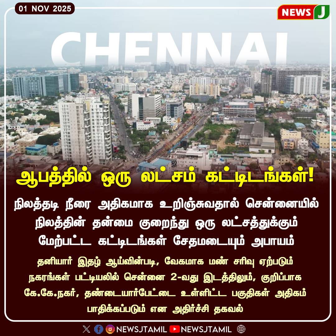 சென்னையில் நிலத்தடி நீர் அளவு குறைவதால் கட்டிடங்களின் நிலைத்தன்மை பாதிப்பு