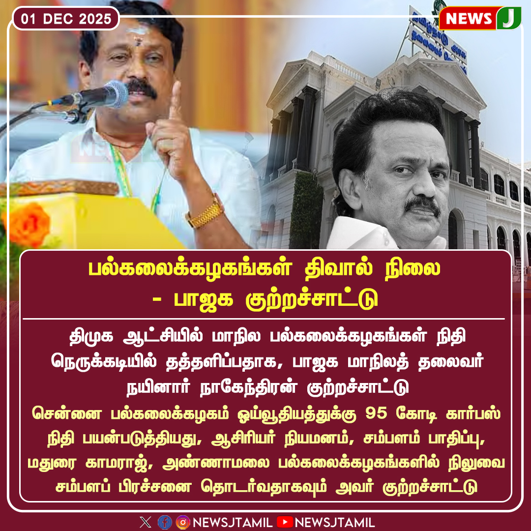 தமிழக அரசின் நிர்வாகத் தோல்வியால் பல்கலைக்கழகங்கள் நிதி நெருக்கடியில் சிக்கியுள்ளதாக பாஜக குற்றம்சாட்டுகிறது | BJP claims poor governance has pushed Tamil Nadu universities...