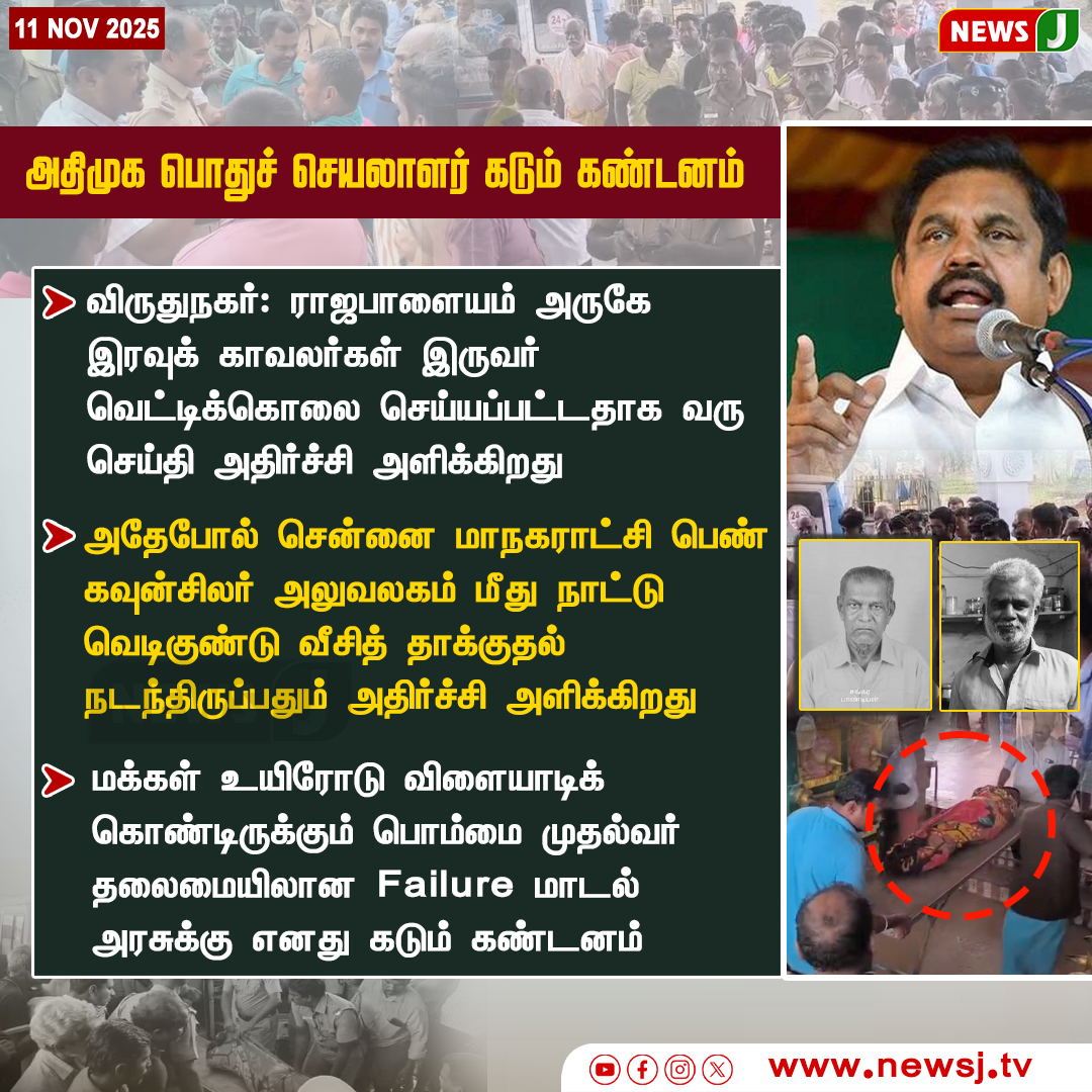 தமிழக செய்திகள் அதிமுக பொதுச்செயலாளர் கடும் கண்டனம் | AIADMK General Secretary Condemns State... விருதுநகர் மற்றும் சென்னை சம்பவங்களில் அதிமுக கண்டனம்! | AIADMK strongly condemns incidents in Virudhunagar and Chennai! BY News J November 11, 2025 0 Comment