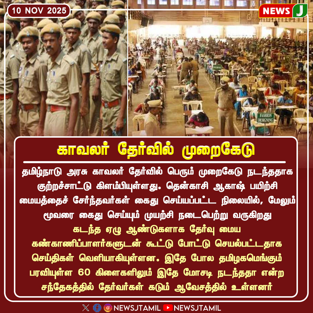 தமிழக செய்திகள் காவலர் தேர்வில் முறைகேடு | Irregularities Found in Tamil Nadu Police... தேர்வு மையங்களில் திடீர் சோதனை – பலர் கைது. BY News J November 10, 2025 0 Comment