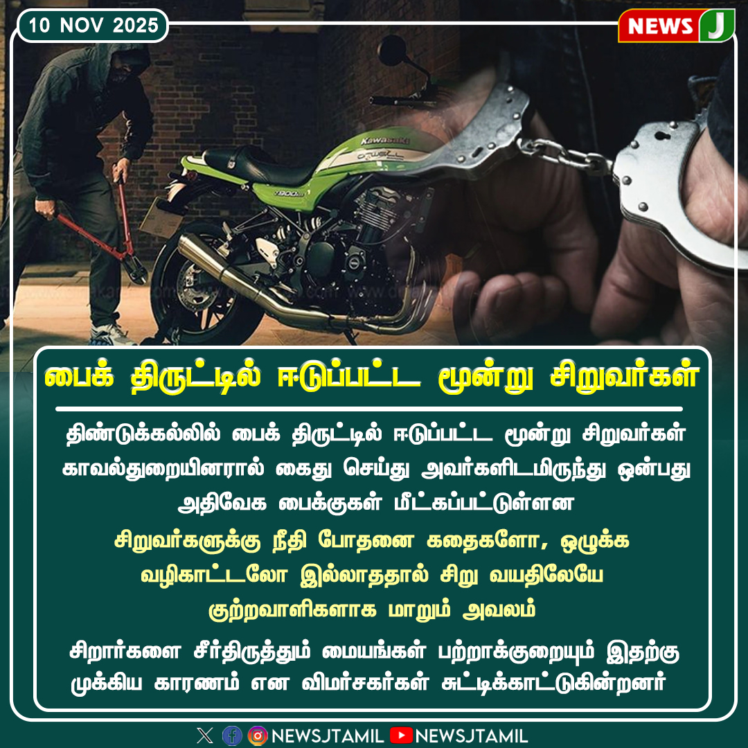 தமிழக செய்திகள் பைக் திருட்டில் ஈடுபட்ட மூன்று சிறுவர்கள் | Three Minors Caught in... திண்டுக்கல்லில் பைக் திருட்டில் ஈடுபட்ட மூன்று சிறுவர்கள் காவல்துறையினரால் கைது செய்யப்பட்டனர். | Three minors arrested in Dindigul for involvement in a series... BY News J November 10, 2025 0 Comment