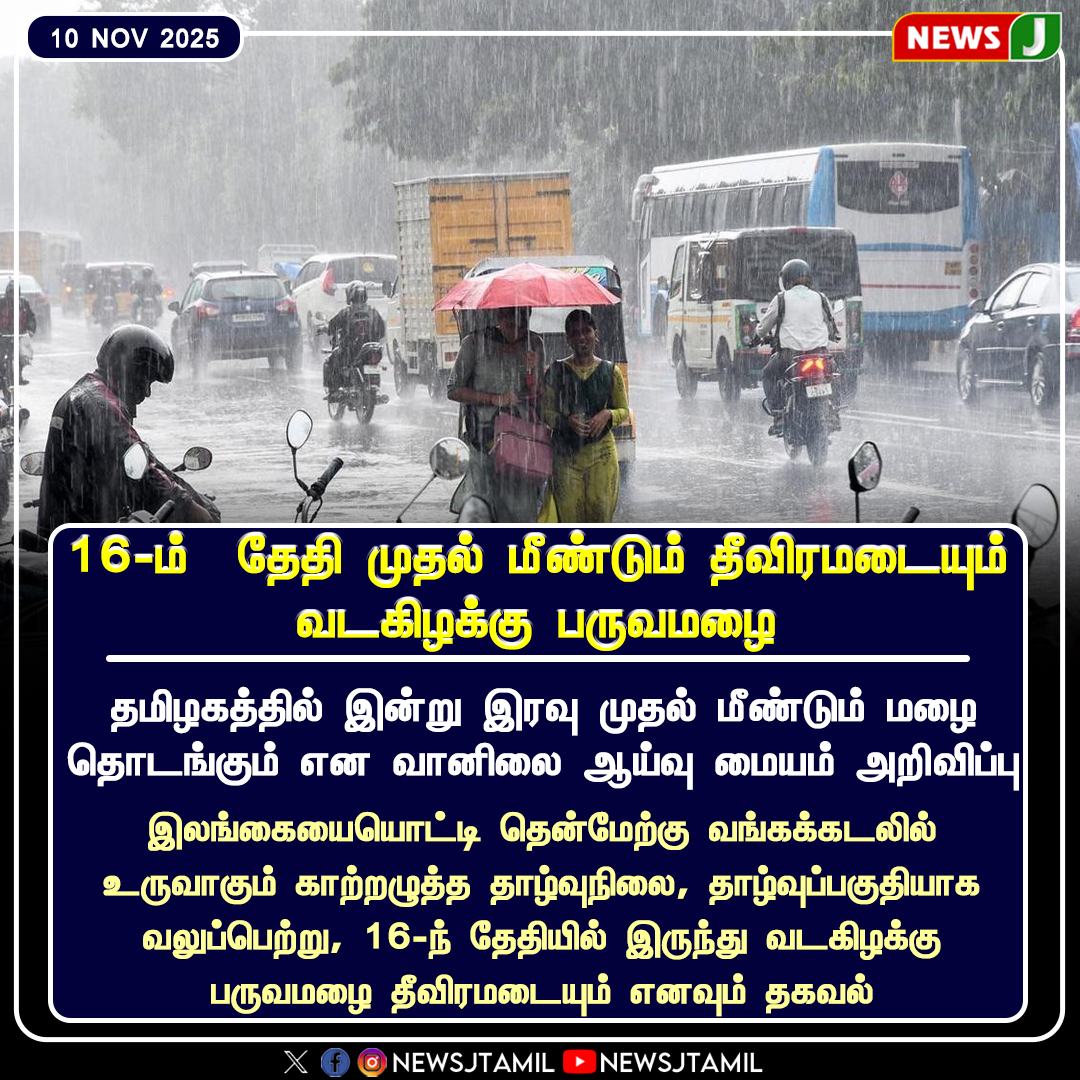 தமிழக செய்திகள் 16ம் தேதி முதல் மீண்டும் தீவிரமடையும் வடகிழக்குப் பருவமழை | Northeast Monsoon... வானிலை ஆய்வு மையம் எச்சரிக்கை – தமிழகத்தின் பல பகுதிகளில் கனமழை வாய்ப்பு. BY News J November 10, 2025 0 Comment