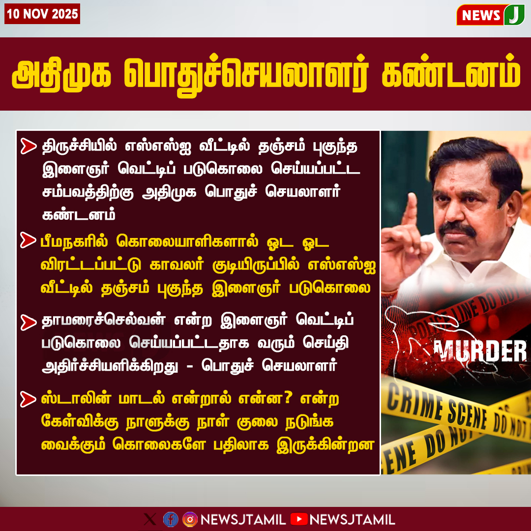 தமிழக செய்திகள் அதிமுக பொதுச்செயலாளர் கண்டனம் | AIADMK General Secretary Condemns Incident திருச்சியில் எஸ்எஸ்ஜே வீட்டில் நடந்த கொலை சம்பவம் அதிர்ச்சியை ஏற்படுத்தியது | AIADMK leader condemns the shocking murder incident in Trichy. BY News J November 10, 2025 0 Comment
