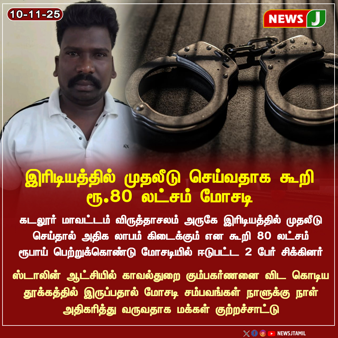 தமிழக செய்திகள் இரிடியத்தில் முதலீடு செய்வதாக கூறி ரூ.80 லட்சம் மோசடி | ₹80 Lakh... கடலூர் மாவட்டத்தில் பெரிய முதலீட்டு மோசடி – 2 பேர் கைது. BY News J November 10, 2025 0 Comment
