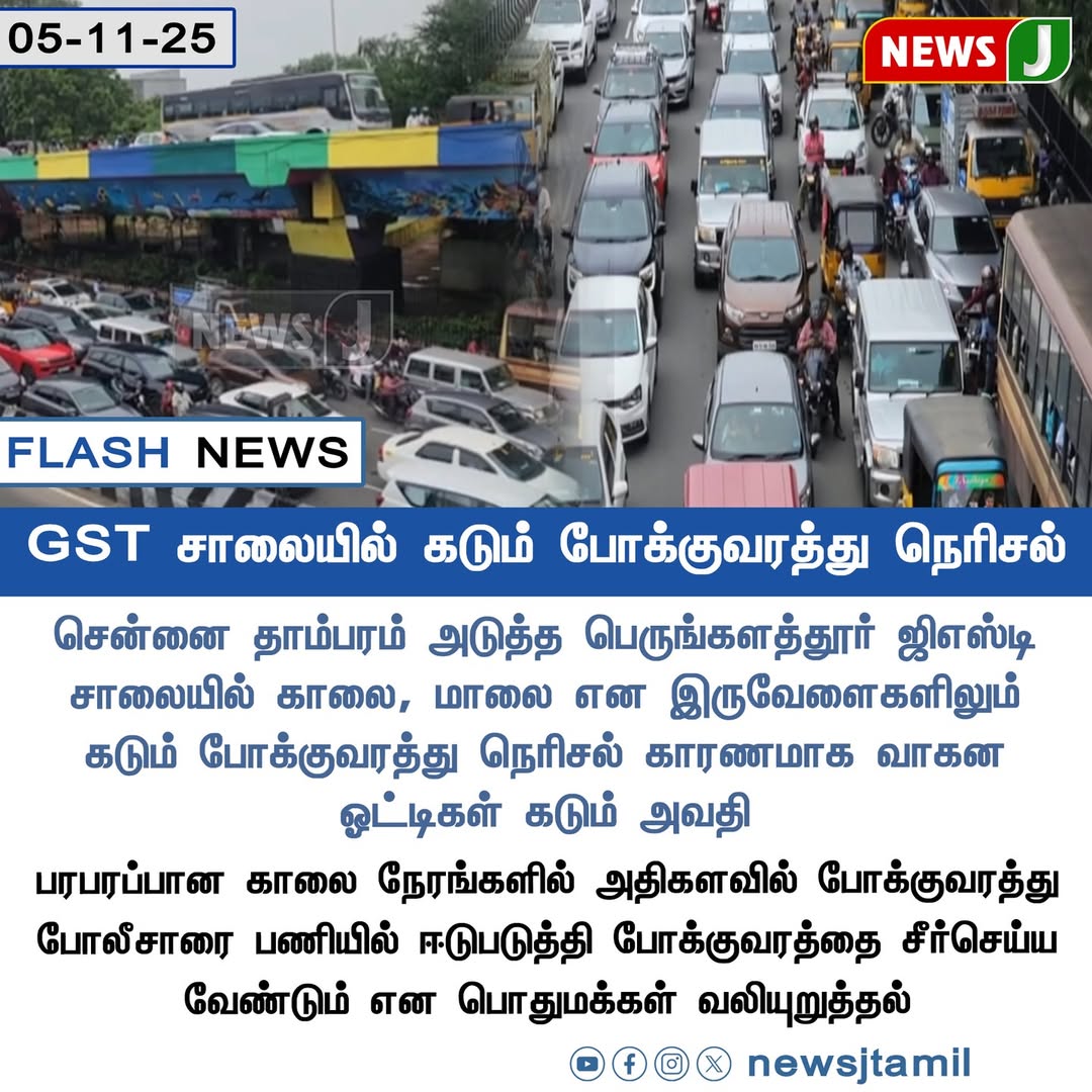 சென்னையில் மழை மற்றும் வாகன நெரிசலால் ஜி.எஸ்.டி சாலையில் போக்குவரத்து கடுமையாக பாதிப்பு | Heavy rains and vehicle pile-ups have caused severe traffic...