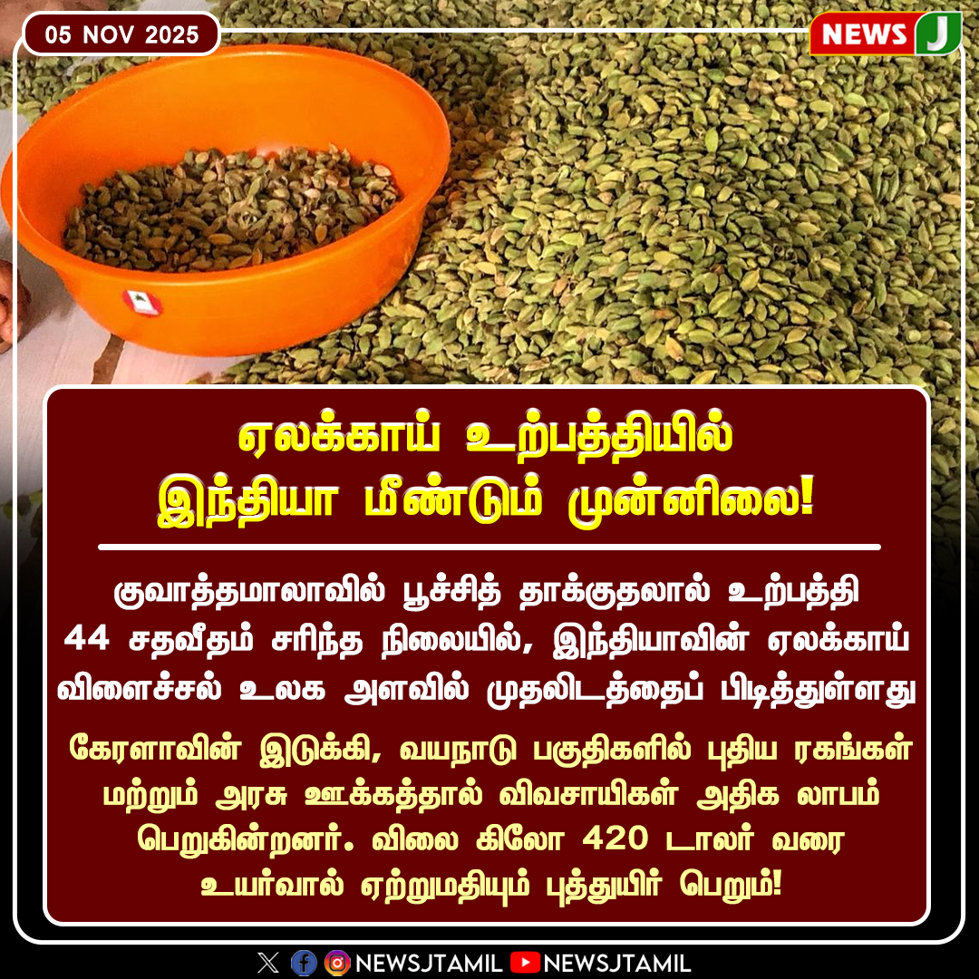 குவாத்தமாலாவில் பூச்சி தாக்குதலால் உற்பத்தி 44% சரிந்த நிலையில், இந்தியா மீண்டும் உலக ஏலக்காய் உற்பத்தியில் முதலிடம் பிடித்துள்ளது | With Guatemala’s production down by...