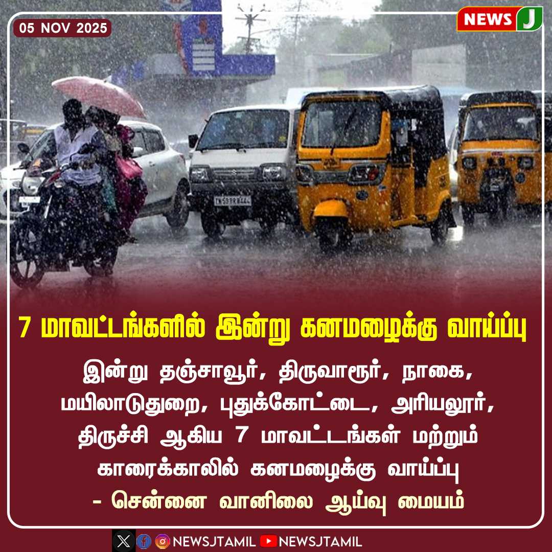 இன்று தஞ்சாவூர், திருவாரூர், நாகை, மயிலாடுதுறை, புதுக்கோட்டை, அரியலூர், திருச்சி ஆகிய 7 மாவட்டங்களில் கனமழை பெய்ய வாய்ப்புள்ளதாக சென்னை வானிலை ஆய்வு மையம் அறிவித்துள்ளது. |...