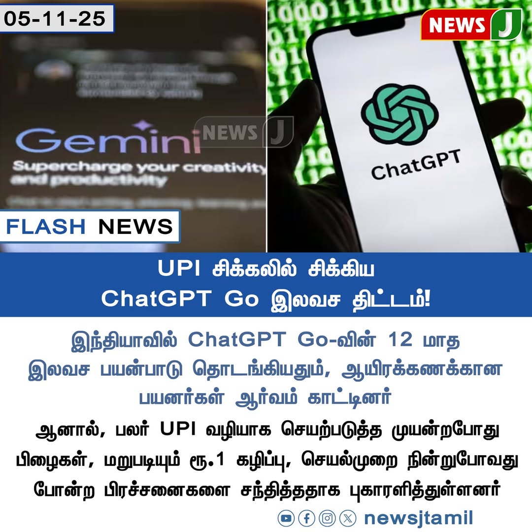இந்தியாவில் ChatGPT Go-வின் 12 மாத இலவச பயன்பாடு தொடங்கியிருந்தாலும், ஆபிரிக்கணக்கான பயனர்கள் தற்போது UPI வழியிலான பணப்பரிவர்த்தனை சிக்கல்கள் குறித்து புகார் தெரிவித்துள்ளனர். | Although...