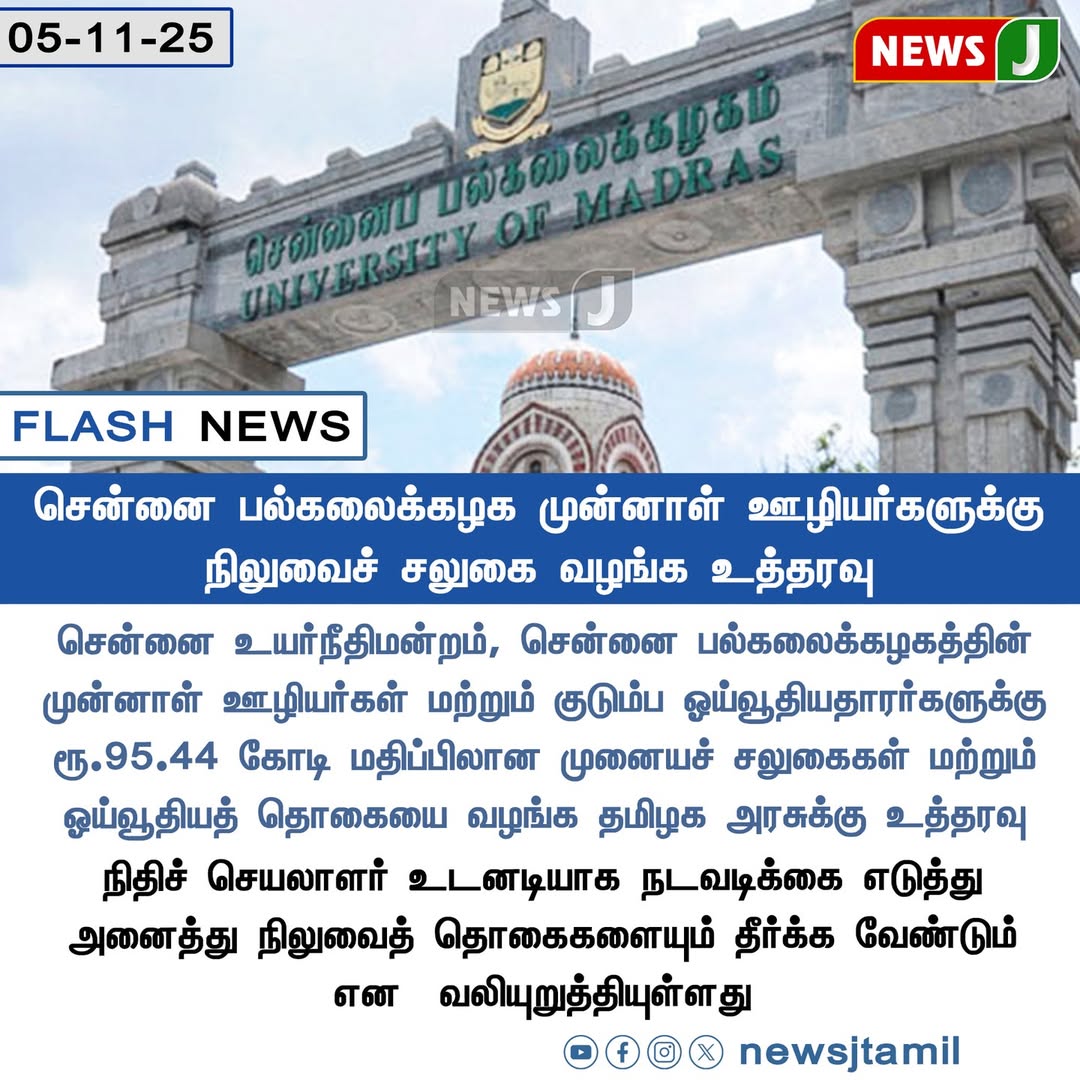 சென்னை உயர் நீதிமன்றம், சென்னை பல்கலைக்கழகத்தின் முன்னாள் ஊழியர்கள் மற்றும் குழுவுப் ஓய்வூதியதாரர்களுக்கு ரூ.95.44 கோடி மதிப்பிலான நிலுவைச் சலுகைகள் மற்றும் ஓய்வூதியத் தொகைகளை வழங்க தமிழ்நாடு...