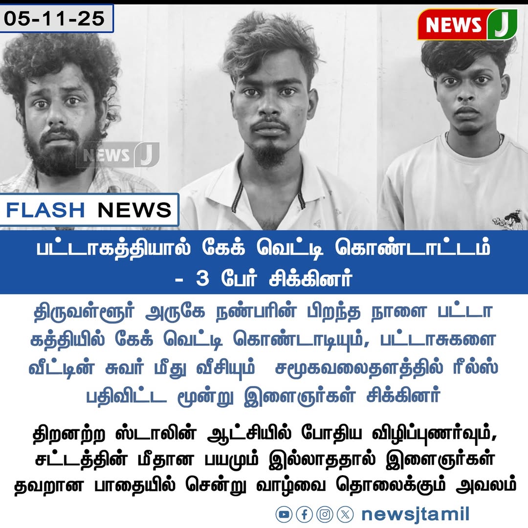 திருவள்ளூர் அருகே நன்பரின் பிறந்தநாளை கொண்டாடிய இளைஞர்கள், பட்டாகத்தியால் கேக் வெட்டி வீடியோவை சமூக வலைதளத்தில் பகிர்ந்ததால், போலீசார் மூவரையும் கைது செய்தனர். | In Tiruvallur,...