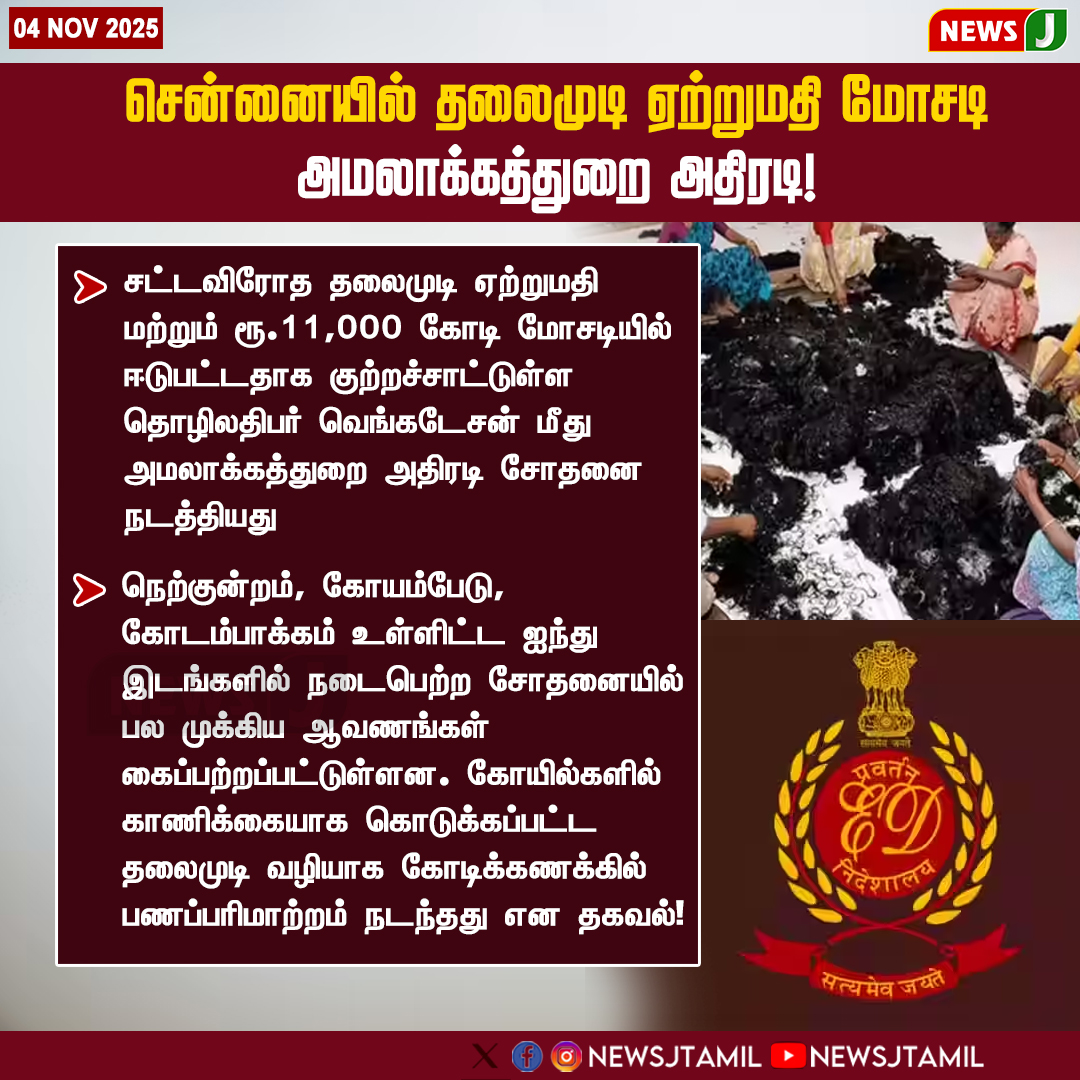 சட்டவிரோத தலைமுடி ஏற்றுமதி மற்றும் ரூ.11,000 கோடி மோசடியில் ஈடுபட்டதாக குற்றச்சாட்டு எழுந்ததையடுத்து, தொழிலதிபர் வெங்கடேசன் மீது அமலாக்கத்துறை (ED) அதிரடி சோதனைகள் நடத்தியது. | The...