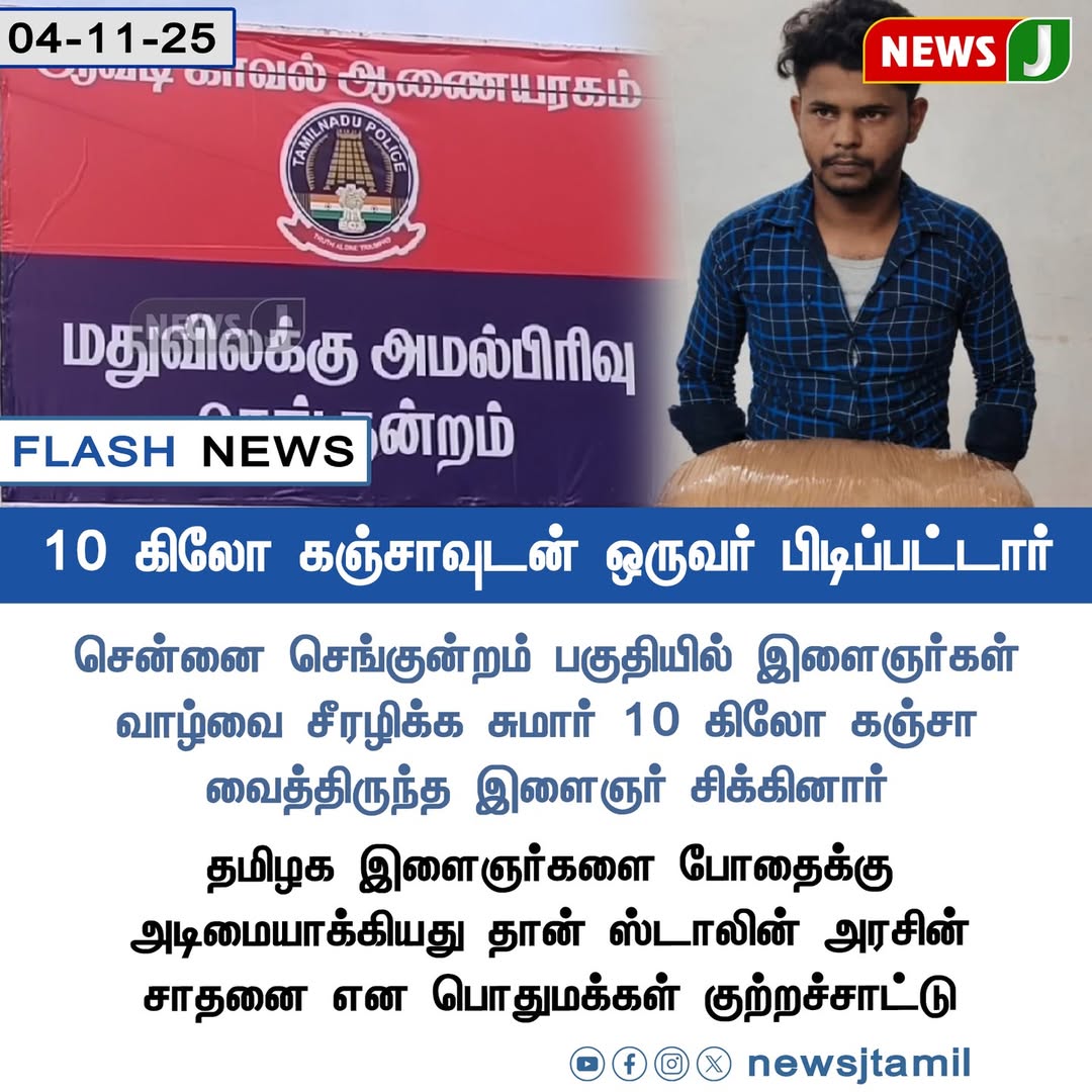 சென்னை செங்குன்றம் பகுதியில் போலீசார் நடத்திய திடீர் சோதனையில், 10 கிலோ கஞ்சாவை வைத்திருந்த இளைஞர் ஒருவர் கைது செய்யப்பட்டார். | Police in Chengundram, Chennai,...