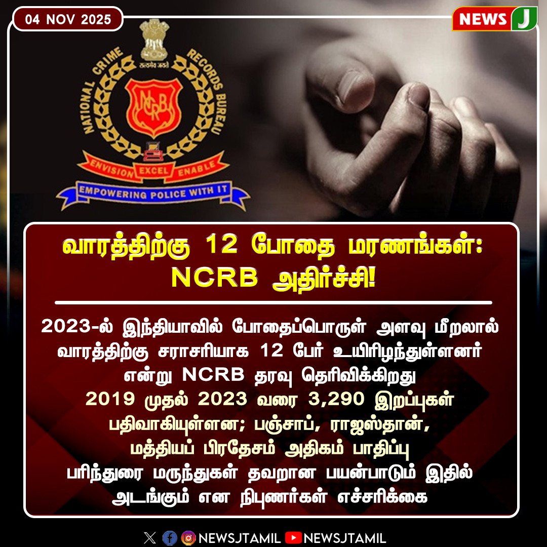 2023ஆம் ஆண்டில் மட்டும் இந்தியாவில் போதைப்பொருள் அதிவிநியோகமும் தவறான பயன்பாடும் காரணமாக வாரத்திற்கு சராசரியாக 12 பேர் உயிரிழந்துள்ளனர் என தேசிய குற்றப்பதிவு வாரியம் (NCRB) அதிர்ச்சி...