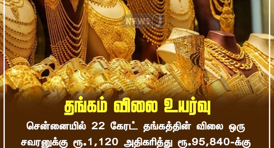 சென்னையில் 22 கேரட் தங்கத்தின் விலை இன்று மேலும் உயர்ந்துள்ளது. ஒரு சவரனுக்கு ரூ.1,120 அதிகரித்து ரூ.95,840 என புதிய உயரத்தை எட்டியுள்ளது.