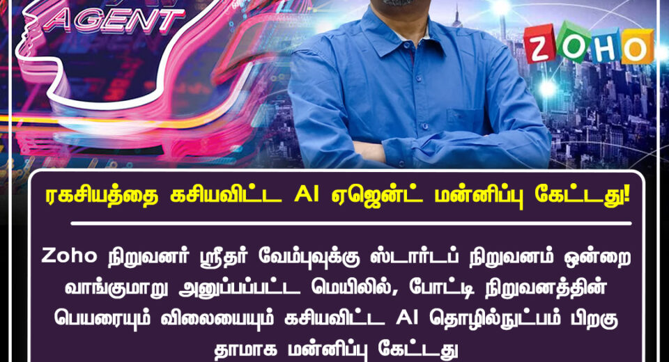 Zoho நிறுவனத்தில் நடந்ததாக கூறப்படும் AI ஏஜென்ட் ரகசிய தகவல் கசிவு விவகாரம் குறித்து விளக்கம் கேட்டது | Clarification sought regarding alleged AI agent leak at Zoho