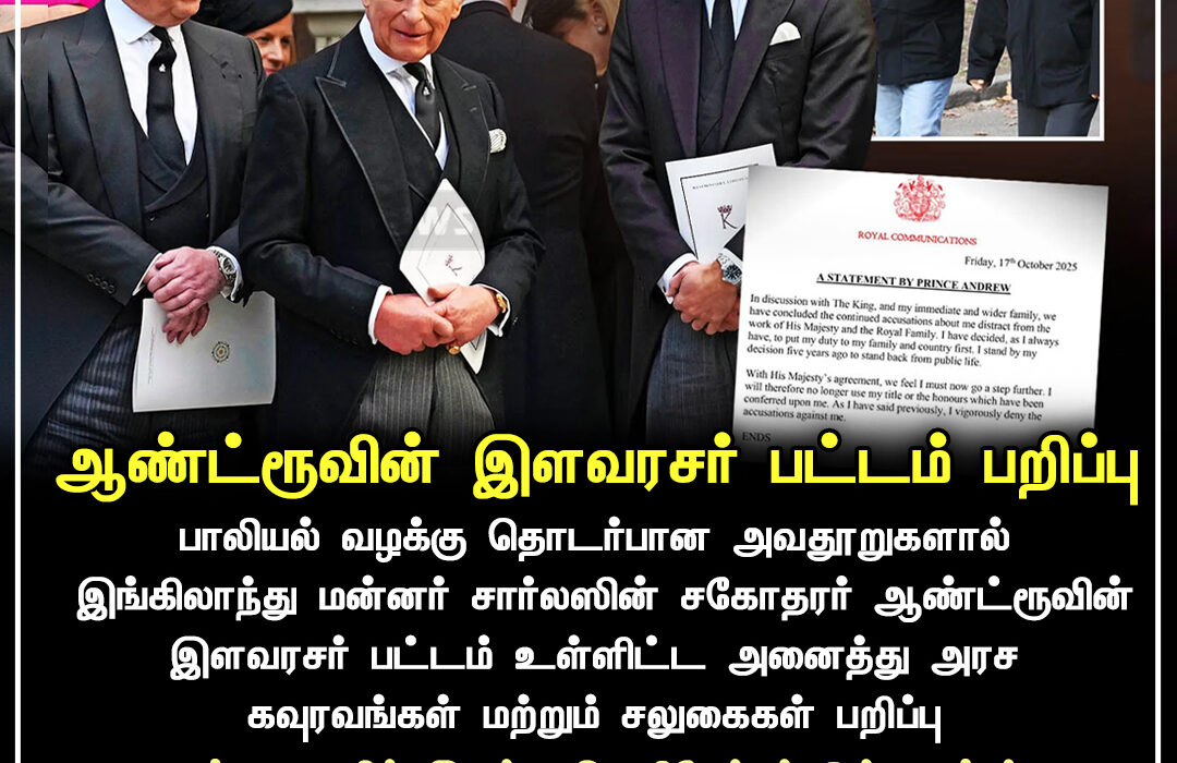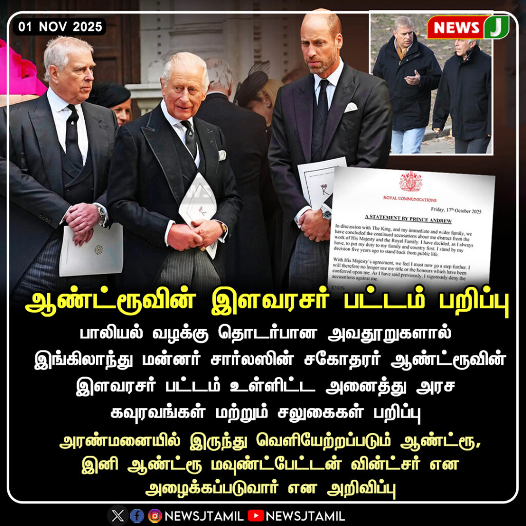 பாலியல் வழக்கில் ஏற்பட்ட புதிய குற்றச்சாட்டுகளின் பின்னணியில், இங்கிலாந்து மன்னர் சார்லஸ் தனது சகோதரர் ஆண்ட்ரூவின் இளவரசர் பட்டத்தையும், அனைத்து அரச மரியாதைகளையும் அதிகாரபூர்வமாக நீக்கி வைத்துள்ளார். இதுகுறித்து அரச மன்றம் மற்றும் சட்ட ஆலோசகர்கள் இணைந்து உறுதி செய்துள்ளனர்.