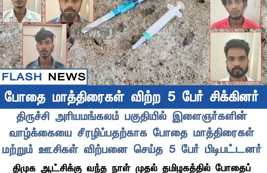 Police in Trichy’s Ariyamangalam area have arrested five individuals accused of selling narcotic pills and injections to young people. Investigations revealed that the accused were distributing these substances secretly to students and workers.