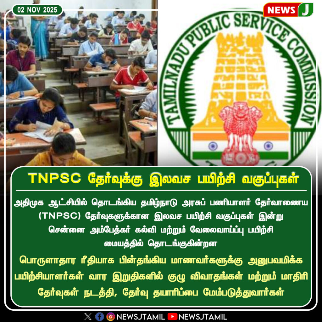 The Tamil Nadu government has launched free coaching classes for TNPSC aspirants through employment training centers and colleges, including Chennai’s Ambedkar College. The initiative aims to help economically weaker students prepare effectively for upcoming government job exams.