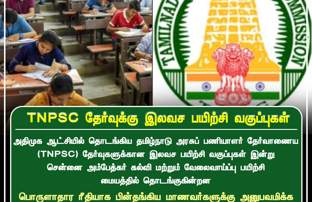 அதிமுக ஆட்சியில் தொடங்கிய தமிழ்நாடு அரசுப் பணியாளர் தேர்வாணைய (TNPSC) தேர்வுகளுக்கான இலவச பயிற்சி வகுப்புகள் இன்று சென்னை அம்பேத்கர் கல்லூரி மற்றும் வேலைவாய்ப்பு பயிற்சி மையத்தில் தொடங்குகின்றன. இந்த திட்டம் மாணவர்கள் மற்றும் வேலை தேடுபவர்களுக்கு இலவசமாக பயிற்சி அளிக்கும் வகையில் ஏற்பாடாகியுள்ளது.