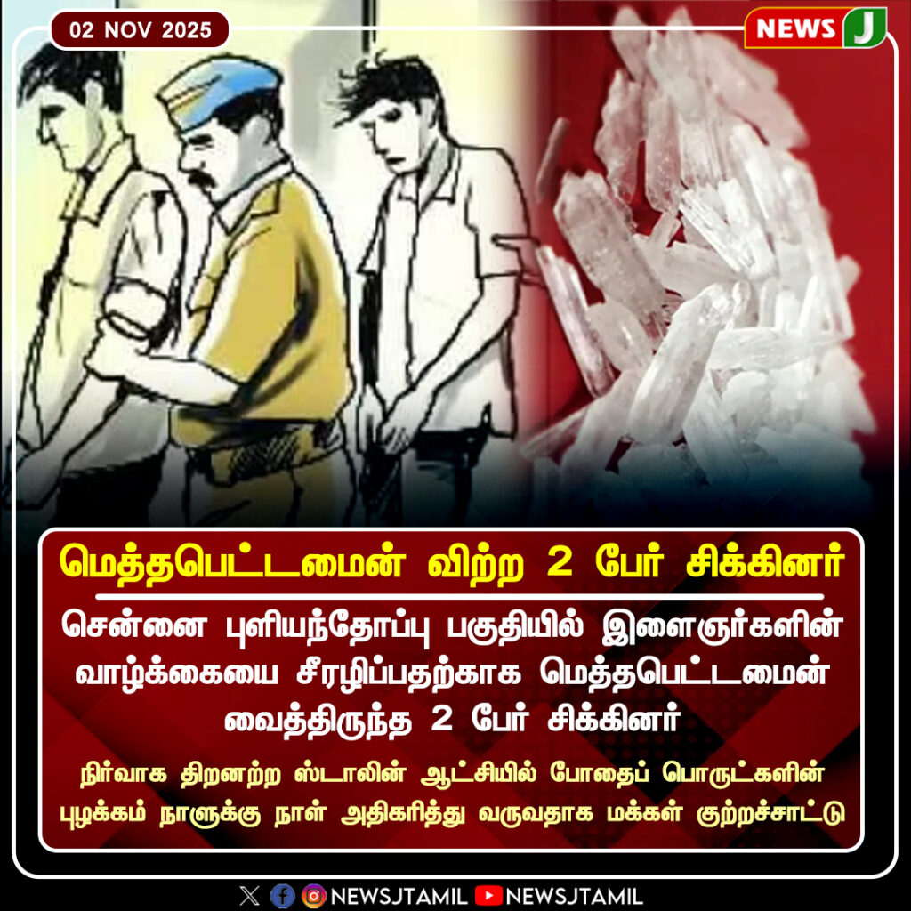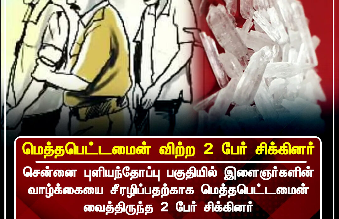 Police in Pulianthope, Chennai, arrested two individuals for allegedly selling methamphetamine to local youths. Authorities have seized a significant quantity of the drug and warned of stricter action as narcotics trade continues to rise across the city.