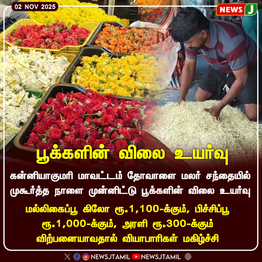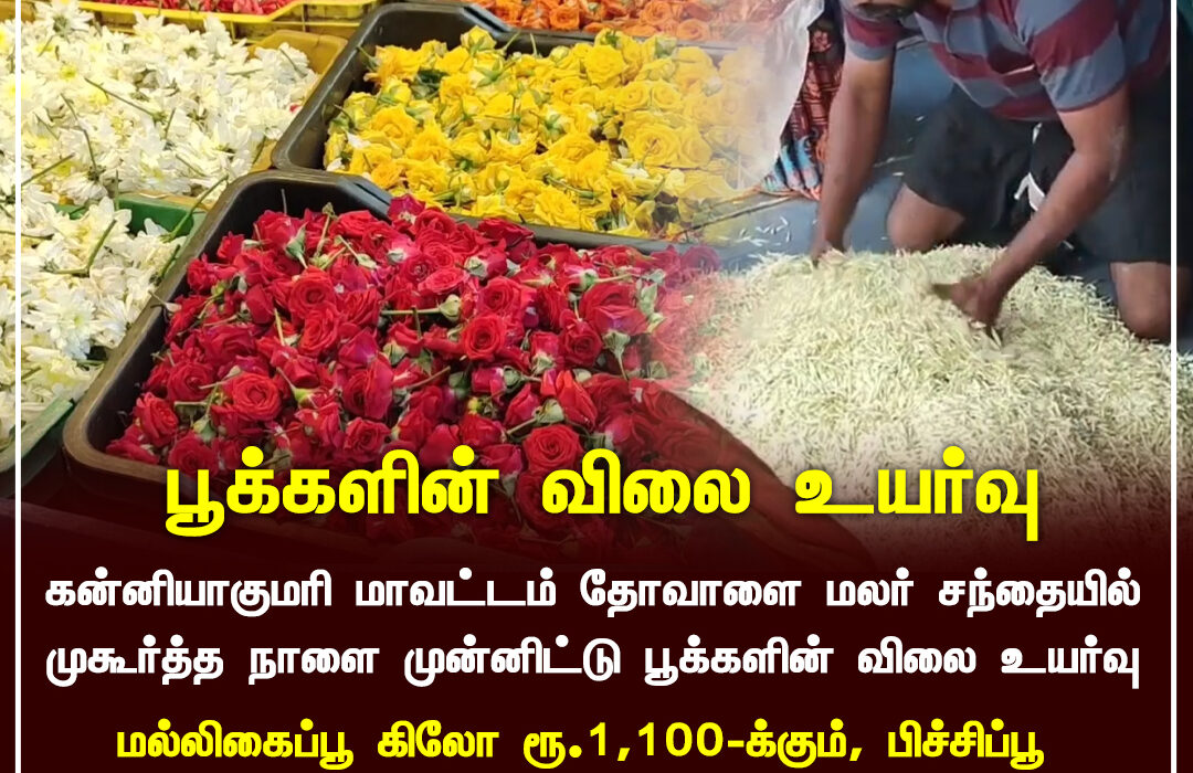 The price of flowers in Kanyakumari’s Thovalai flower market has surged sharply ahead of the festive season. Jasmine now sells at ₹1,100/kg, while rose and arali prices have also spiked due to high demand and supply shortages caused by rain.