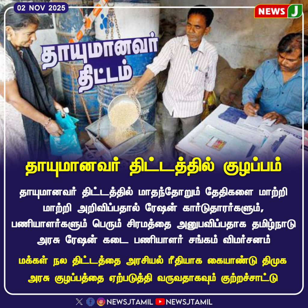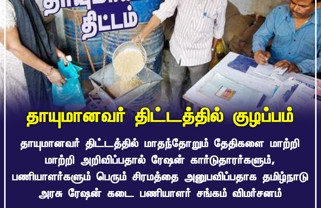 தாயுமானவர் திட்டத்தில் மாதந்தோறும் தேதிகள் மாற்றி மாற்றி அறிவிக்கப்படுவதால் ரேஷன் கார்டுதாரர்கள் குழப்பத்தில் உள்ளனர் | Frequent date changes in the Thayumanavar Scheme create confusion among ration cardholders
