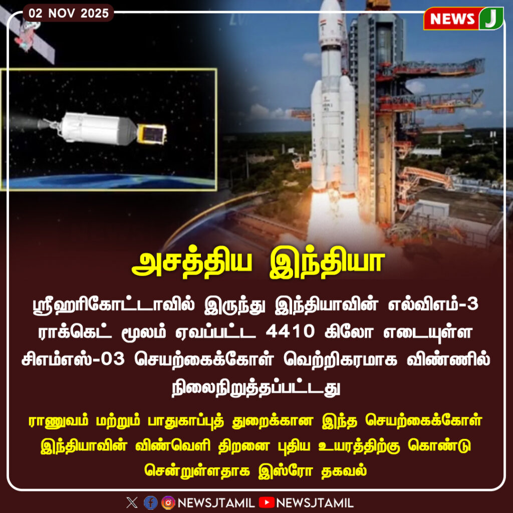 இந்திய விண்வெளி ஆராய்ச்சி மையமான இஸ்ரோ, தனது எல்.வி.எம்-3 ராக்கெட் மூலமாக 4410 கிலோ எடையுள்ள சிம்னஸ்-03 செயற்கைக்கோளை வெற்றிகரமாக விண்ணில் நிலைநிறுத்தியுள்ளது | ISRO successfully launched the 4410 kg CMS-03 satellite into orbit using the LVM-3 rocket from Sriharikota.