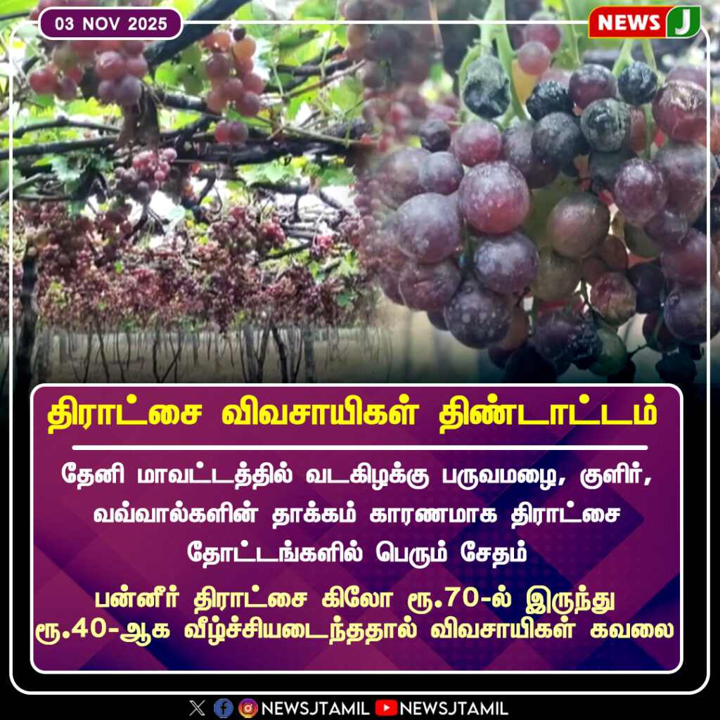 Grape farmers in Theni district are facing severe losses as heavy monsoon rains, cold weather, and bat infestations have destroyed large portions of their vineyards. The constant rainfall has led to fruit rot, while bats have further damaged the ripe produce.