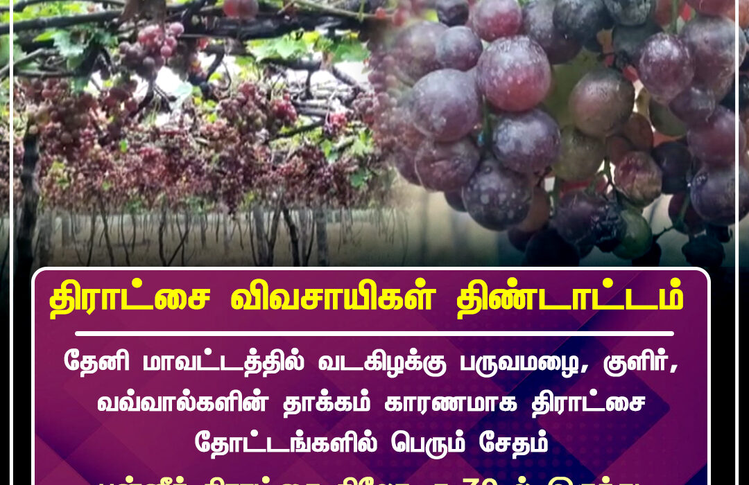 தேனி மாவட்டத்தில் பருவமழை, குளிர், வவ்வால்களின் தாக்கம் காரணமாக திராட்சை தோட்டங்களில் பெரும் சேதம் ஏற்பட்டுள்ளது | Heavy rains, cold weather, and bat infestations have caused significant damage to grape farms in Theni district.