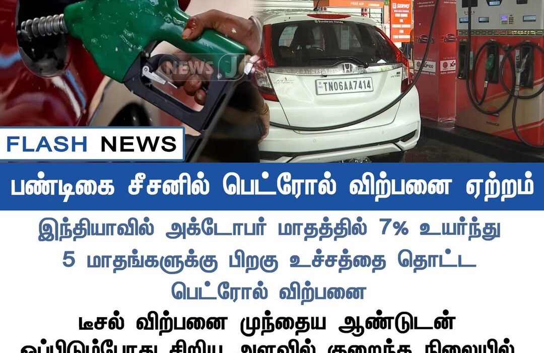 இந்தியாவில் அக்டோபர் மாதத்தில் பெட்ரோல் விற்பனை 7% உயர்ந்தது; கடந்த 5 மாதங்களில் இது மிக உயர்ந்த விற்பனை என பதிவாகியுள்ளது | Petrol sales in India rose by 7% in October — the highest growth recorded in the past five months.