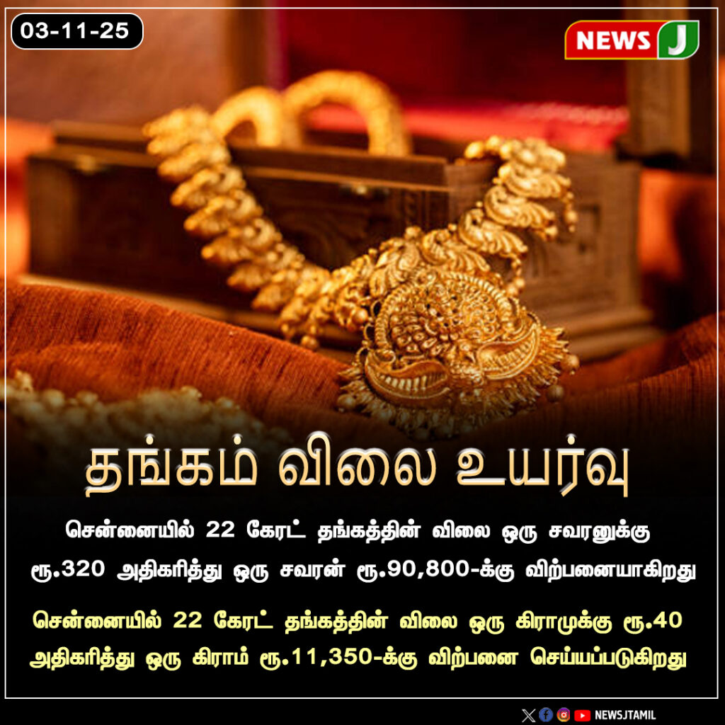 சென்னையில் 22 கேரட் தங்கத்தின் விலை சவரனுக்கு ரூ.320 உயர்ந்து, ஒரு சவரன் ரூ.90,800க்கு விற்பனையாகிறது | The price of 22-carat gold in Chennai rose by ₹320 per sovereign, reaching ₹90,800.