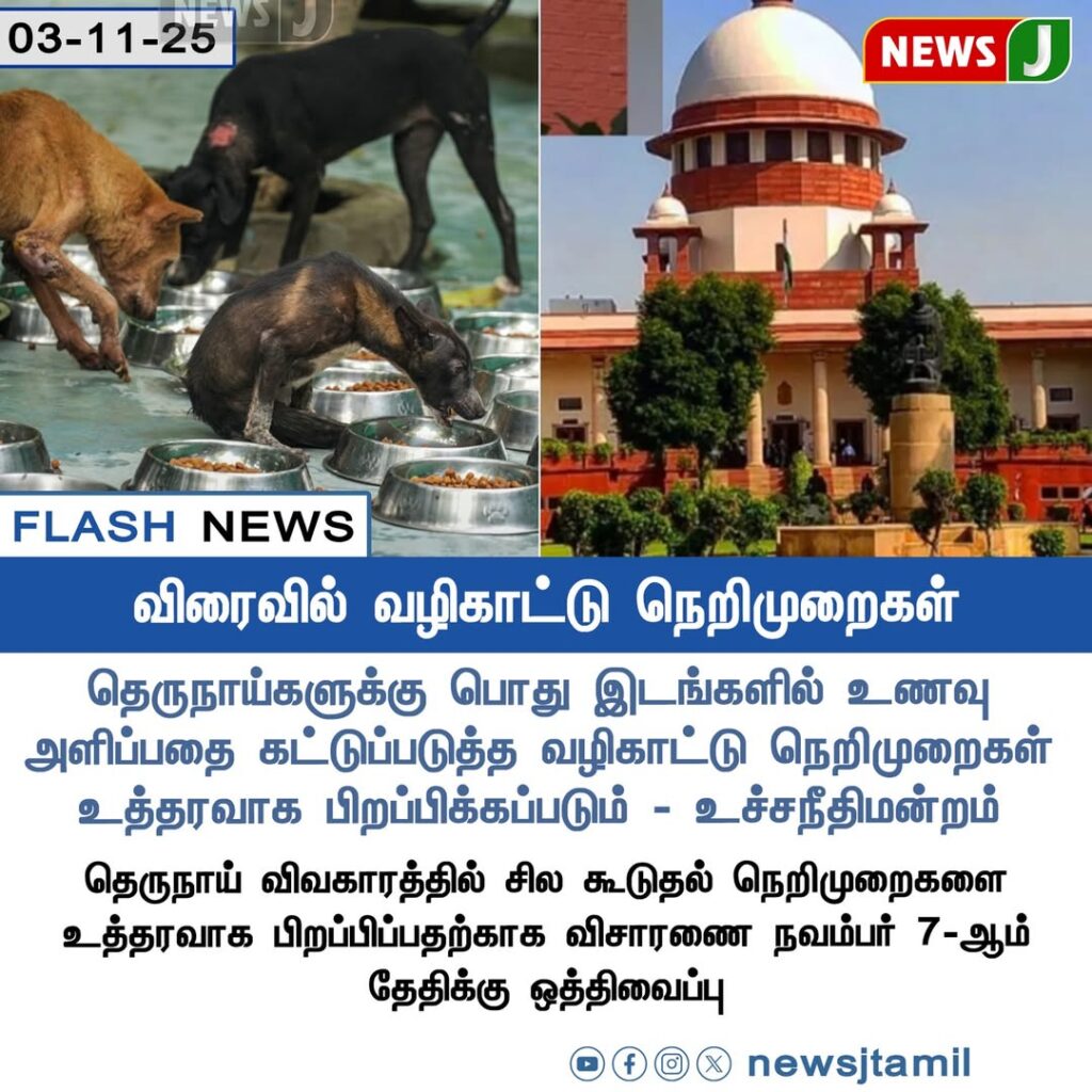 தெருநாய்களுக்கு பொதுவிடங்களில் உணவு அளிப்பதை ஒழுங்குபடுத்தும் வழிகாட்டு நெறிமுறைகள் விரைவில் வெளியிடப்படும் என உச்சநீதிமன்றம் தெரிவித்துள்ளது | The Supreme Court has announced that new guidelines on feeding street dogs in public places will be released soon.