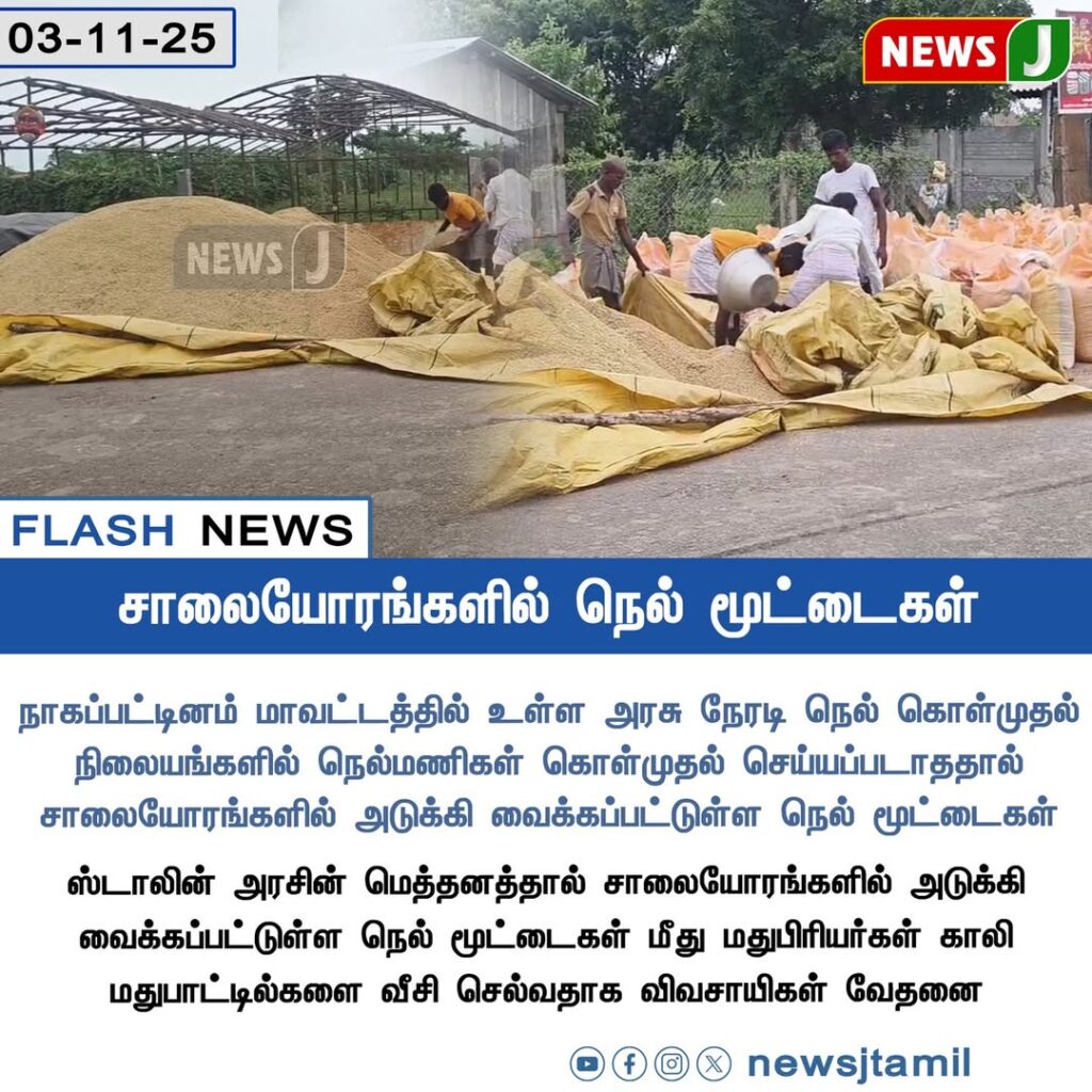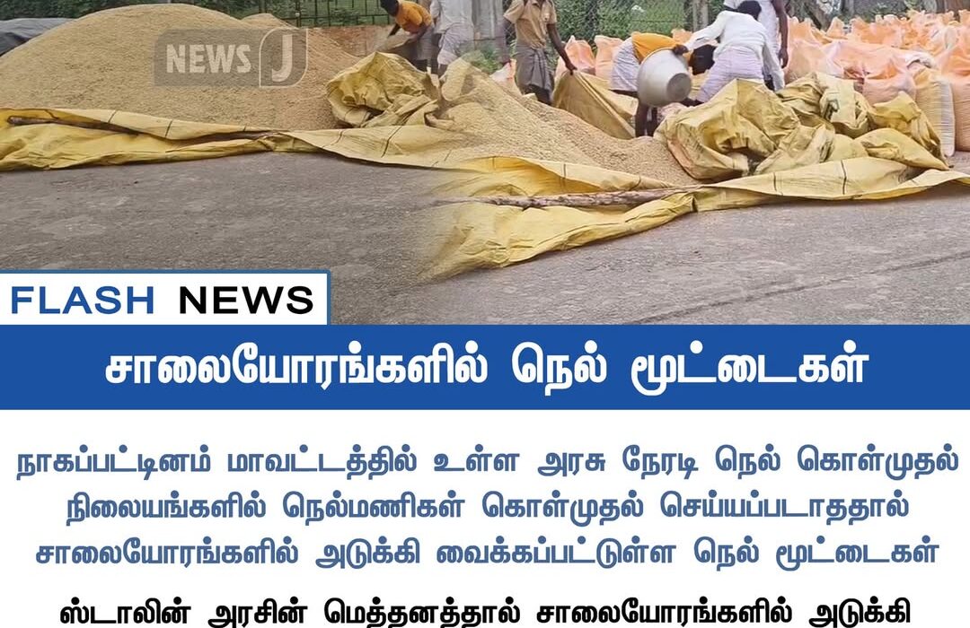 நாகப்பட்டினம் மாவட்டத்தில் உள்ள அரசு நெரடி நெல் கொள்முதல் நிலையங்களில் நெல் வாங்கும் பணிகள் தாமதமாக நடைபெறுவதால், விவசாயிகள் நெல் மூட்டைகளை சாலையோரங்களில் அடுக்கி வைக்கத் தொடங்கியுள்ளனர் | Due to delays in paddy procurement at government direct purchase centers in Nagapattinam district, farmers have started stacking paddy bags along the roadside.