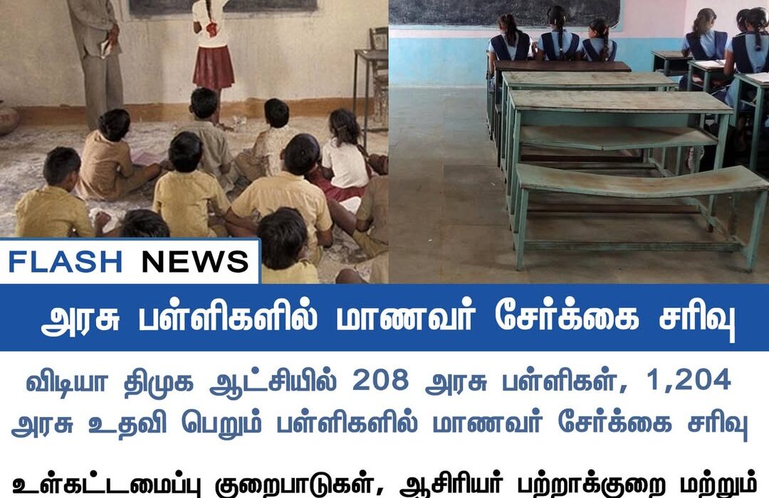 விழுப்புரம் மாவட்டத்தில் திமுக ஆட்சியில் 208 அரசு பள்ளிகள் மற்றும் 1,204 அரசு உதவி பெறும் பள்ளிகளில் மாணவர் சேர்க்கை கணிசமாக குறைந்துள்ளதாக கல்வித் துறை தகவல் தெரிவித்துள்ளது | In Villupuram district, student enrollment has significantly declined in 208 government schools and 1,204 aided schools during the DMK regime, according to the Education Department.