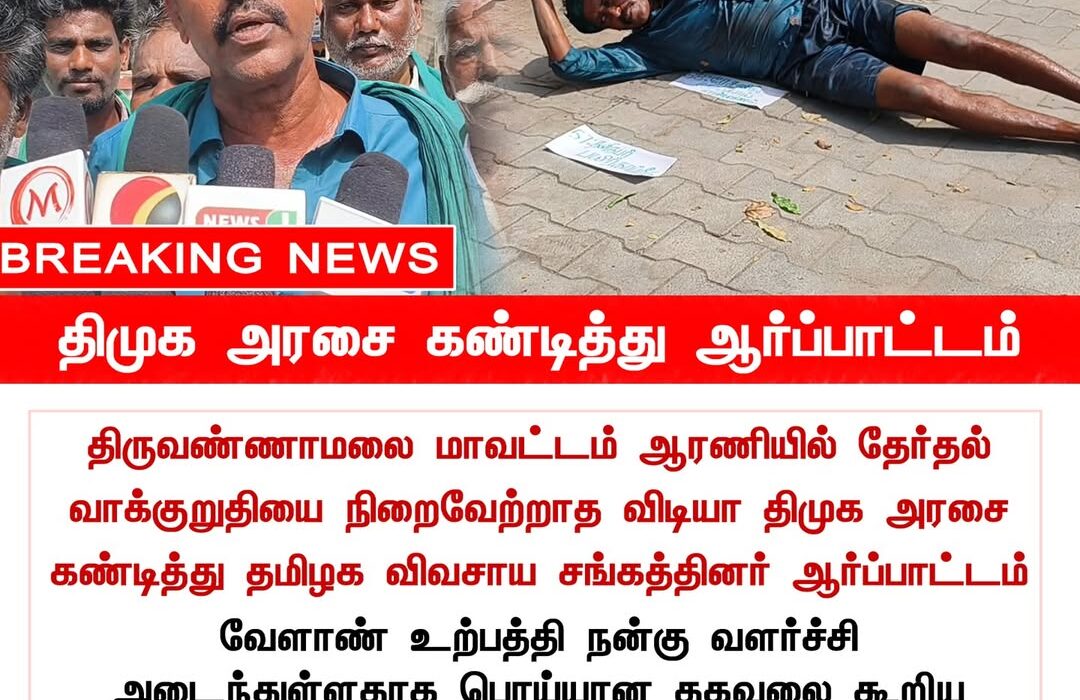 Farmers in Tiruvannamalai’s Arani staged a road blockade protest accusing the DMK government of not keeping its election promises. They demanded proper irrigation support, loan waivers, and immediate relief for crop losses caused by recent rains.