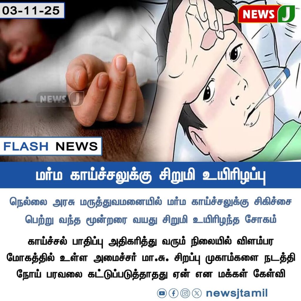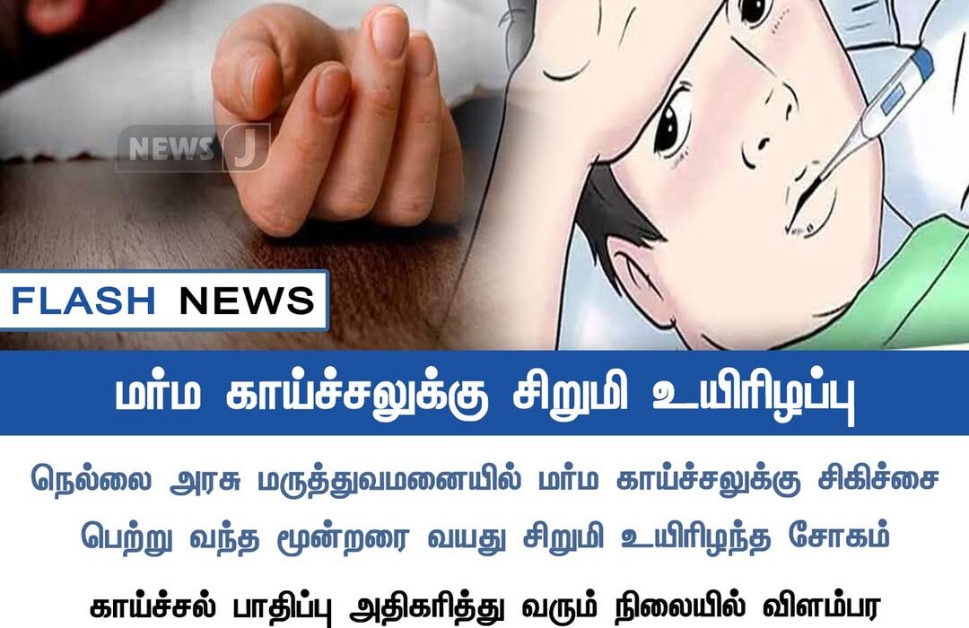சென்னை அருகே நெல்லை அரசு மருத்துவமனையில் மர்ம காய்ச்சலால் சிகிச்சை பெற்று வந்த மூன்றரை வயது சிறுமி உயிரிழந்தது துயரத்தை ஏற்படுத்தியுள்ளது | A three-and-a-half-year-old girl receiving treatment for a mysterious fever at a government hospital in Nellai has tragically died.