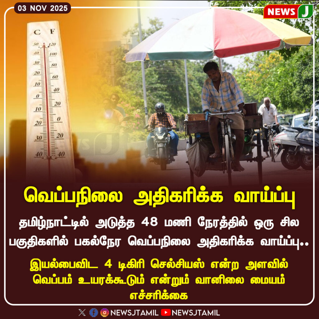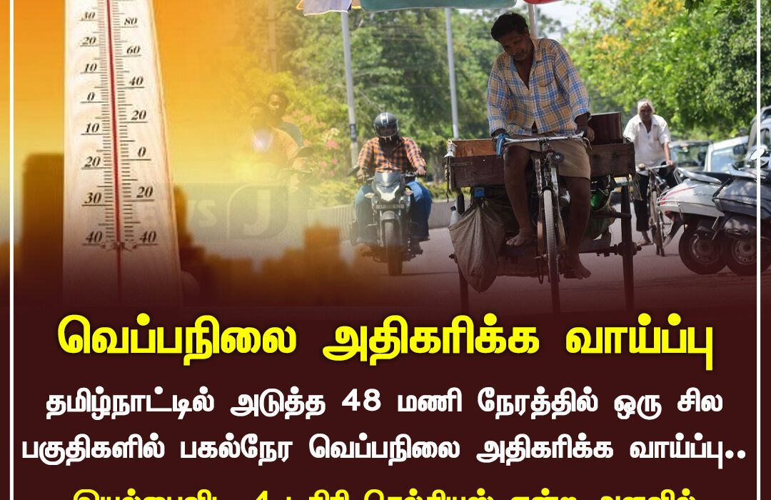தமிழ்நாட்டில் அடுத்த 48 மணி நேரத்தில் சில பகுதிகளில் பகல்நேர வெப்பநிலை அதிகரிக்க வாய்ப்புள்ளதாக வானிலை ஆய்வுமையம் எச்சரிக்கை வெளியிட்டுள்ளது | The Meteorological Department has issued a heatwave alert for several parts of Tamil Nadu over the next 48 hours, warning that daytime temperatures are expected to rise significantly.