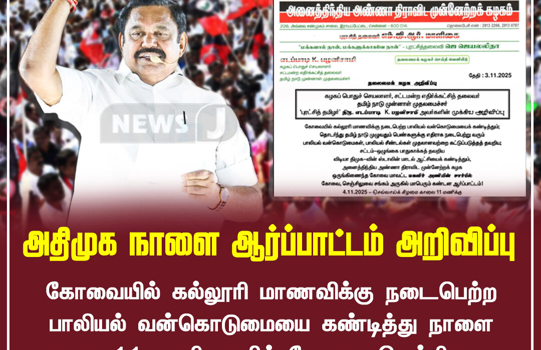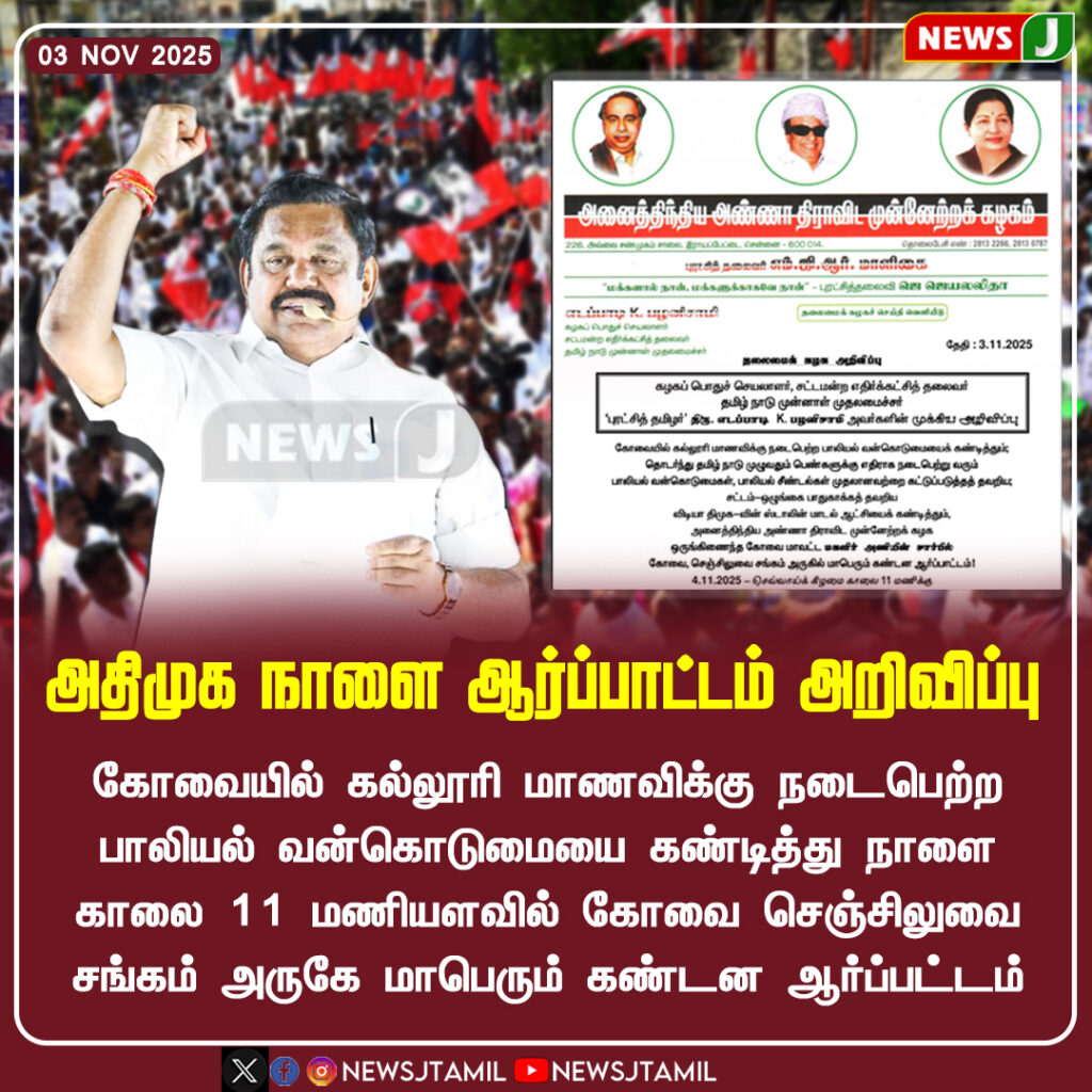 கோவையில் கல்லூரி மாணவிக்கு நடந்த கொடூர பாலியல் வன்கொடுமையை கண்டித்து, அதிமுக நாளை காலை 11 மணிக்கு கோவை செஞ்சிலுவை சங்கம் அருகே மாபெரும் கண்டன ஆர்ப்பாட்டம் நடத்த இருப்பதாக அறிவிக்கப்பட்டுள்ளது | AIADMK has announced a massive protest in Coimbatore tomorrow at 11 a.m. near the Red Cross building, condemning the brutal sexual assault on a college student.