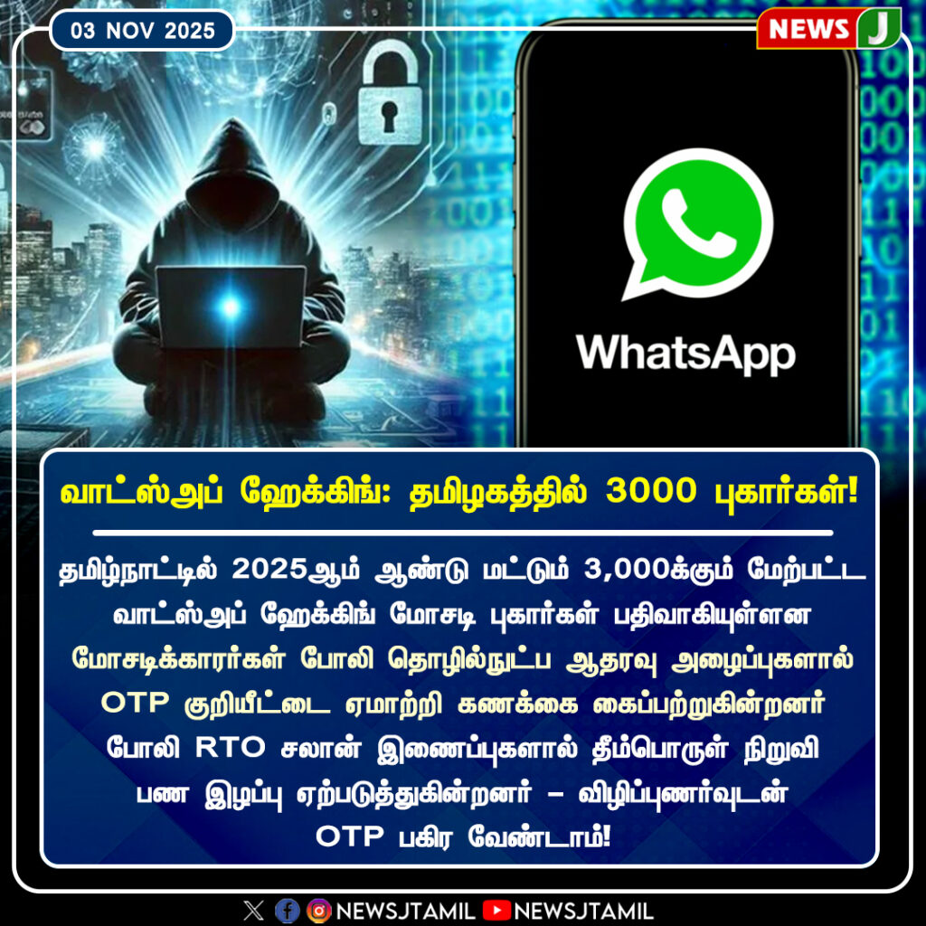 தமிழ்நாட்டில் 2025ஆம் ஆண்டில் மட்டும் 3,000க்கும் மேற்பட்ட வாட்ஸ்அப் ஹேக்கிங் மோசடி புகார்கள் பதிவு செய்யப்பட்டுள்ளதாக தகவல்கள் தெரிவிக்கின்றன | Tamil Nadu has witnessed over 3,000 WhatsApp hacking-related complaints in 2025 alone, according to recent cybercrime reports.