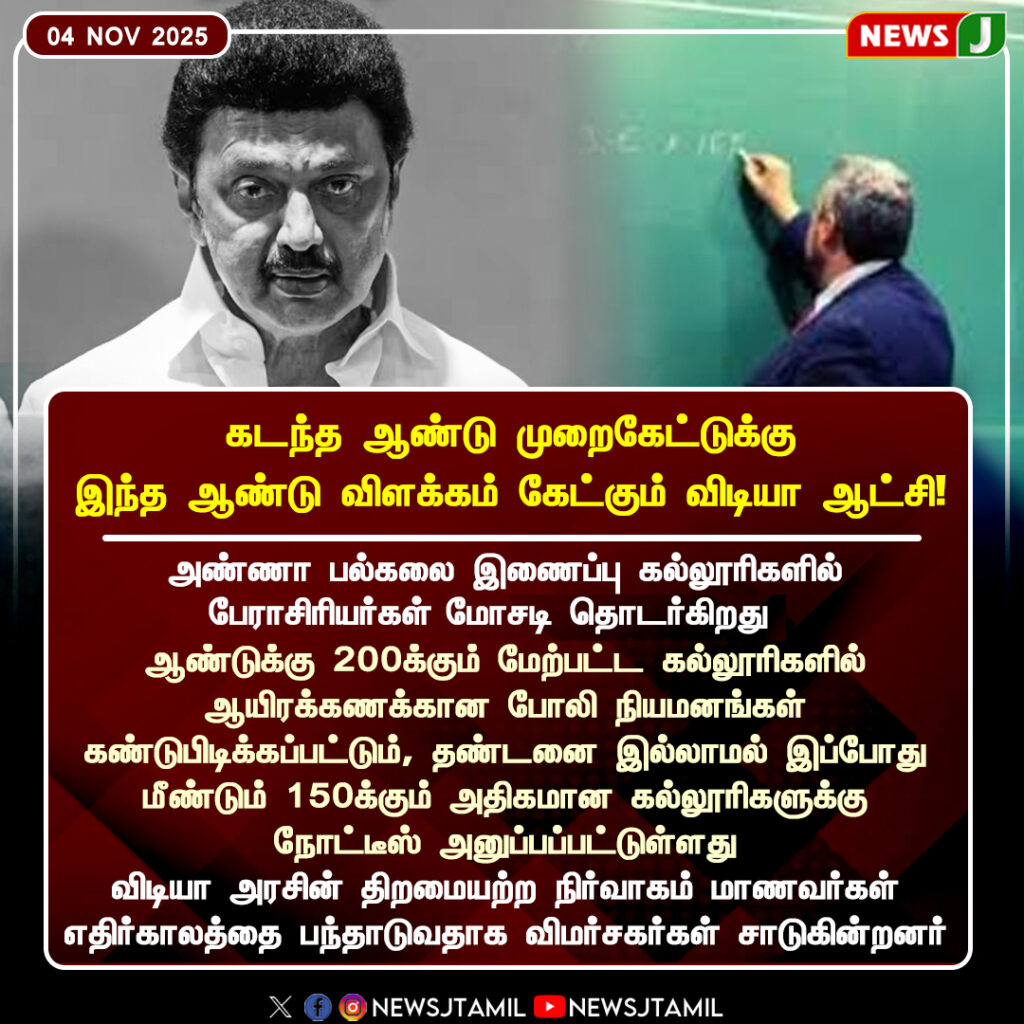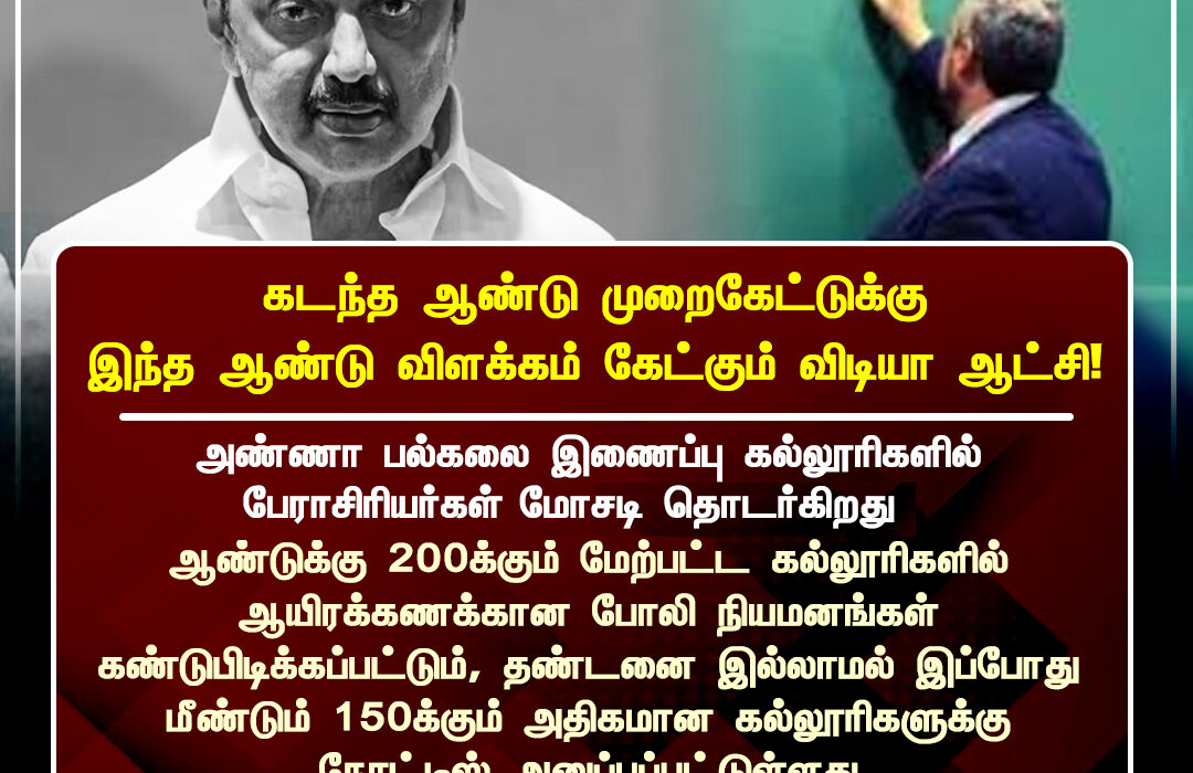 விடியா அரசின் துறைமையற்ற நிர்வாகம் மாணவர்கள் கல்வி நம்பகத்தன்மையை பாதிக்கிறது என கல்வியாளர்கள் குற்றச்சாட்டினர். | Education experts have slammed the DMK government for poor governance, stating that the lack of academic accountability is severely impacting students’ trust and educational standards.