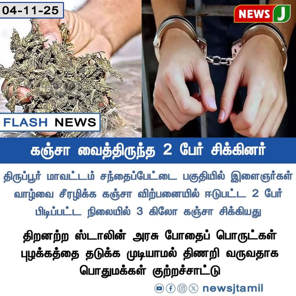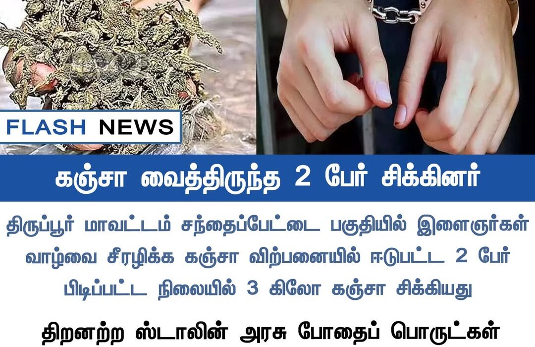 திருப்பூர் மாவட்டம் சந்தைப்பேட்டை பகுதியில் இரு இளைஞர்கள் கஞ்சா விற்பனை செய்துவந்ததாக போலீசார் நடத்திய திடீர் சோதனையில் 3 கிலோ கஞ்சாவுடன் இருவர் கைது செய்யப்பட்டனர். | Police in Thiruppur’s Sandhaipettai area arrested two youths for allegedly selling 3 kg of ganja during a surprise raid.