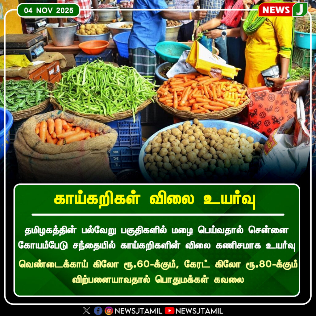 தமிழகத்தின் பல்வேறு பகுதிகளில் மழை பெய்ததால், சென்னை கோயம்பேடு சந்தையில் காய்கறிகளின் விலை கணிசமாக உயர்ந்துள்ளது. | Due to heavy rains across several parts of Tamil Nadu, the vegetable prices at Chennai’s Koyambedu market have seen a sharp rise.