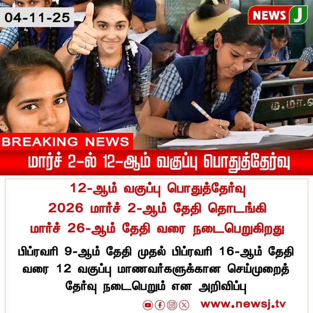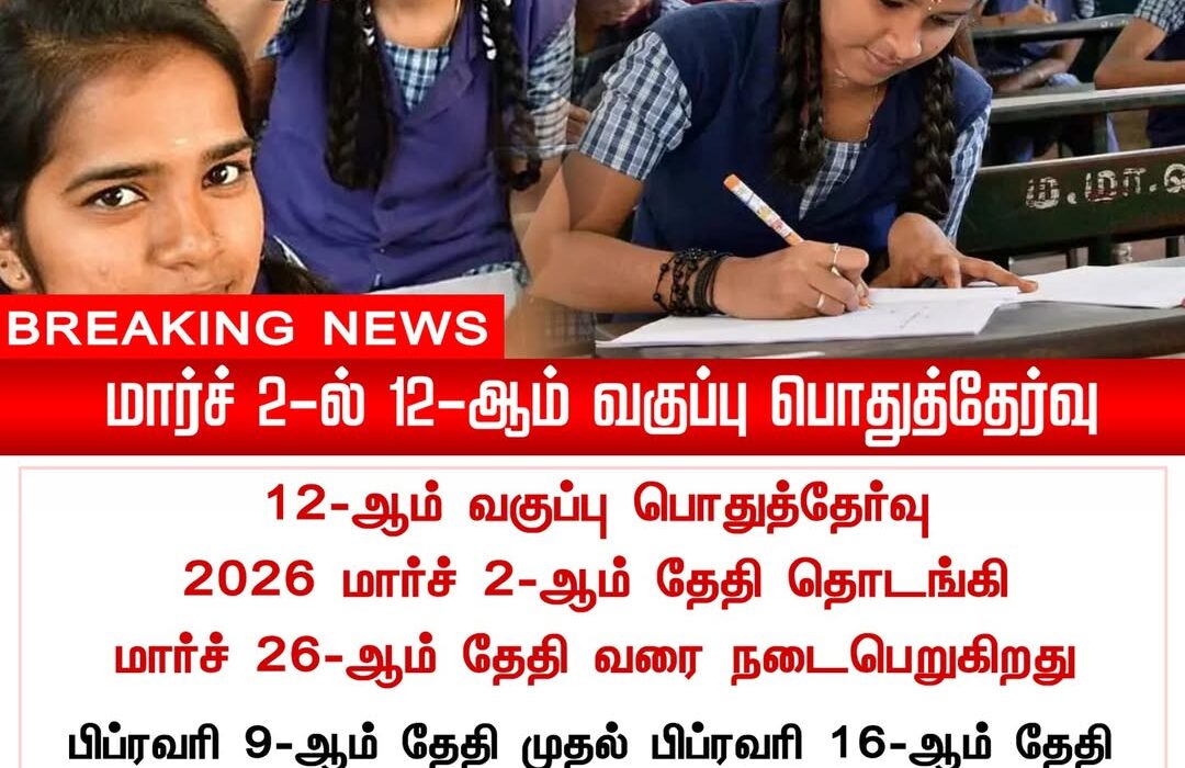 தமிழகத்தில் 12-ஆம் வகுப்பு மாணவர்களுக்கான பொதுத்தேர்வு 2026 மார்ச் 2-ஆம் தேதி தொடங்கி மார்ச் 26-ஆம் தேதி வரை நடைபெறும் என கல்வித்துறை அதிகாரப்பூர்வமாக அறிவித்துள்ளது. | The Tamil Nadu Class 12 Public Examinations 2026 will begin on March 2 and continue till March 26, according to the official announcement by the Education Department.
