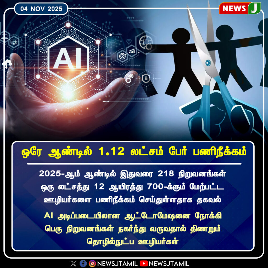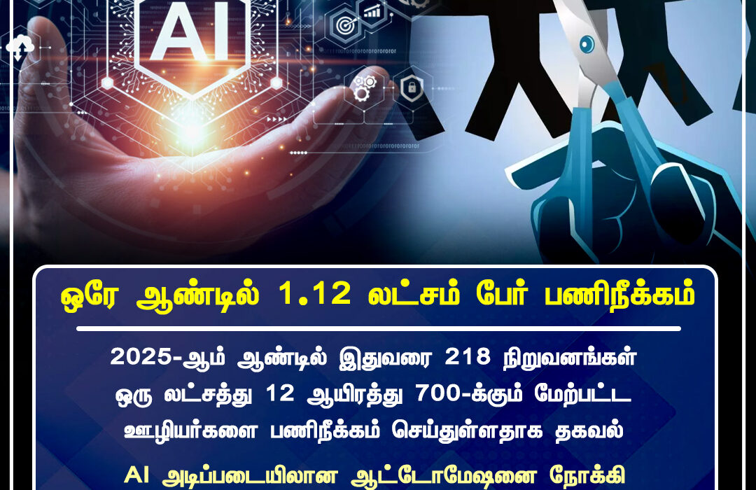 2025 ஆம் ஆண்டில் இதுவரை 218 நிறுவனங்கள், உலகளவில் 1.12 லட்சம் ஊழியர்களை பணிநீக்கம் செய்துள்ளன என அறிக்கை வெளியாகியுள்ளது. | So far in 2025, around 218 companies have laid off over 1.12 lakh employees across the globe, according to a recent report.