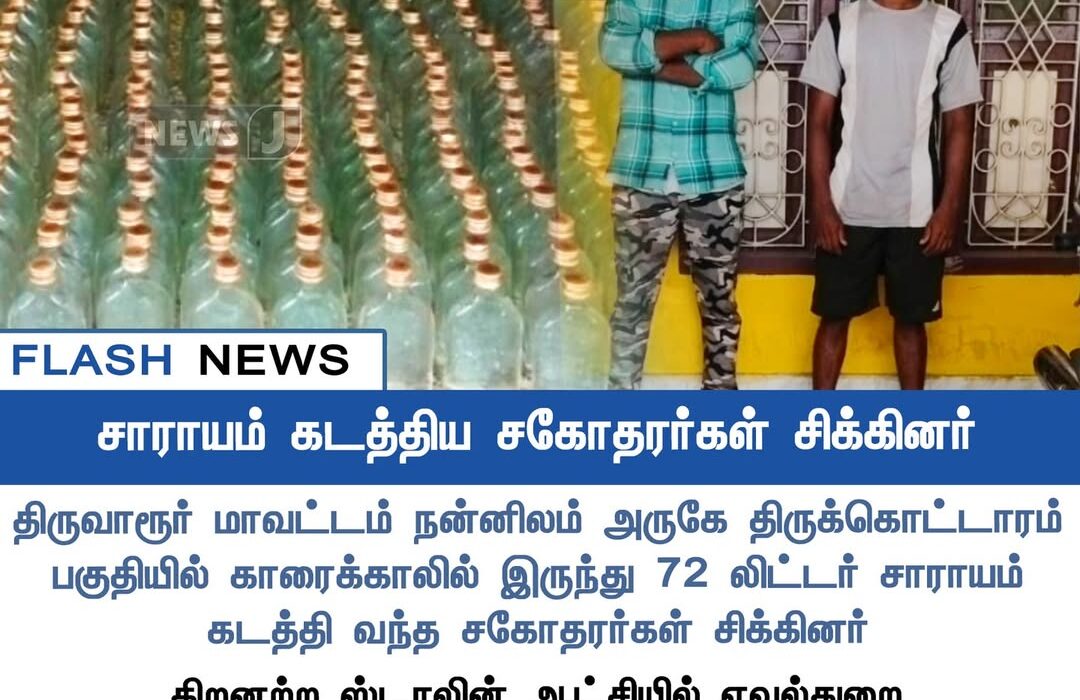 திருவாரூர் மாவட்டம் நன்னிலம் அருகே திருக்கொட்டாரம் பகுதியில் காராக்காவில் இருந்து வந்த 72 லிட்டர் சாராயம் கடத்திய சகோதரர்கள் போலீசாரால் சிக்கினர். | In Tiruvarur district, police arrested two brothers near Thirukkottaram for smuggling 72 litres of illicit liquor from Karaikal.