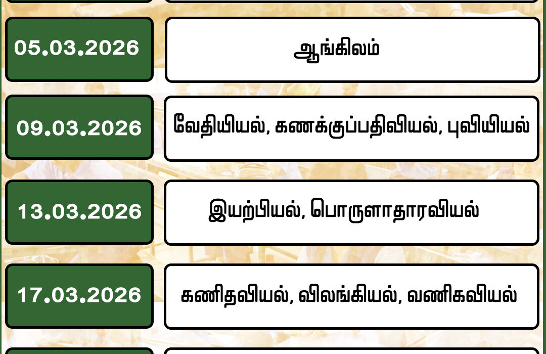 முதல் நாள் மார்ச் 2 அன்று தமிழ் மற்றும் பிற மொழி பாடங்களுக்கான தேர்வும், கடைசி நாள் மார்ச் 26 அன்று கணினி அறிவியல் மற்றும் உயிர்வேதியியல் தேர்வும் நடைபெறும். | The exams will begin on March 2 with Tamil and other language subjects, and conclude on March 26 with Computer Science and Biochemistry.