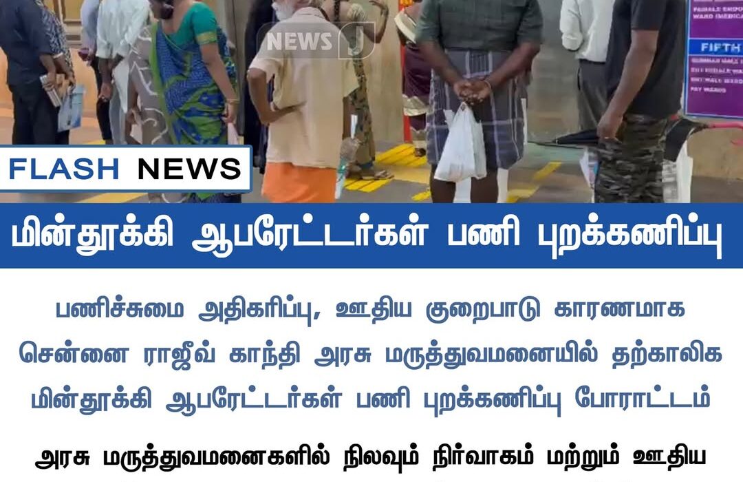 சென்னையில் உள்ள ராஜீவ் காந்தி அரசு மருத்துவமனையில் மின்தூக்கி ஆபரேட்டர்கள் இன்று பணி புறக்கணிப்பு போராட்டத்தில் ஈடுபட்டனர். | Lift operators at Rajiv Gandhi Government Hospital, Chennai, went on strike today, protesting against poor working conditions and delayed payments.