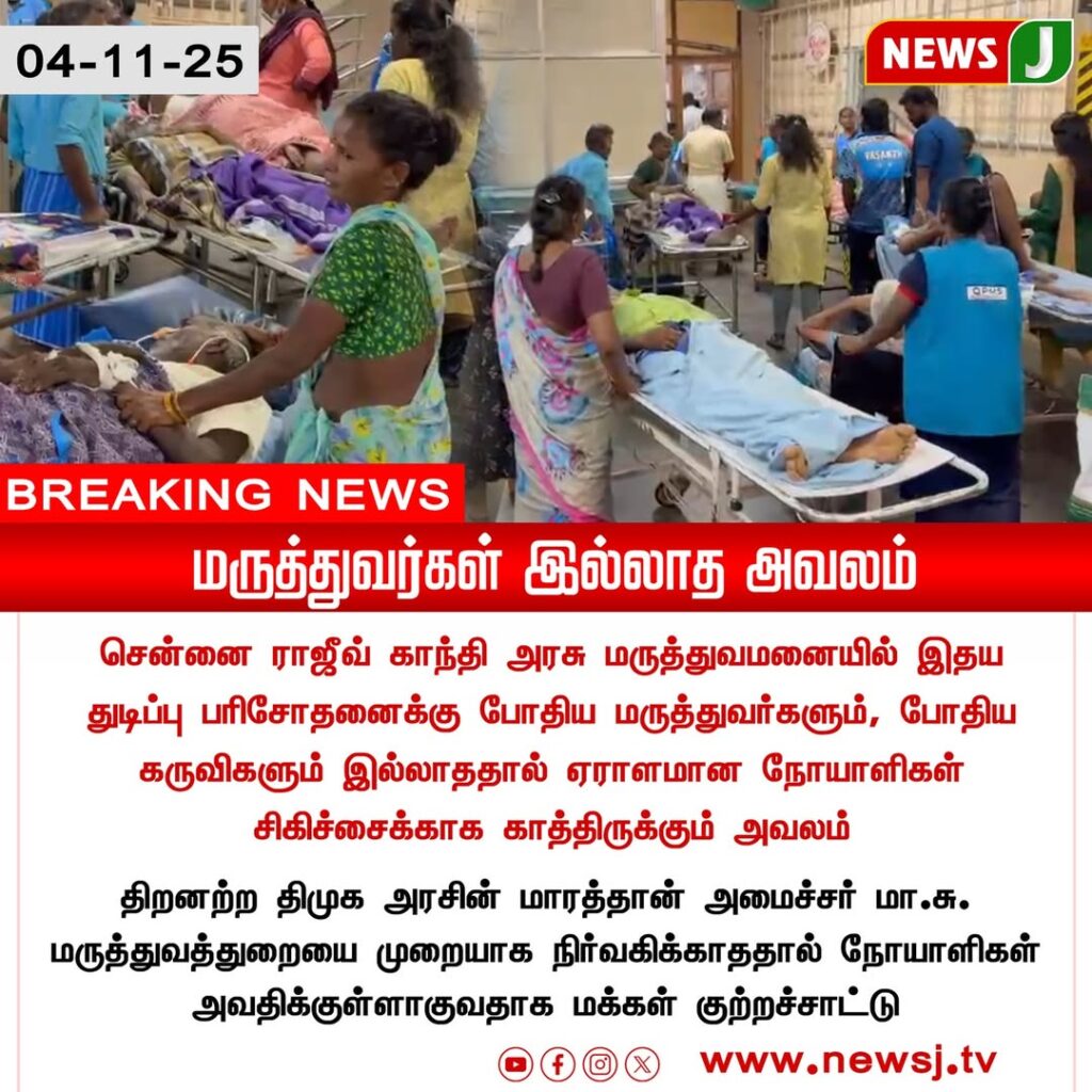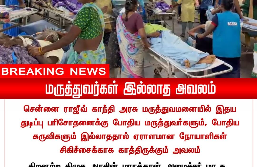 சென்னையில் உள்ள ராஜீவ் காந்தி அரசு மருத்துவமனையில் இத்தய துடிப்பு பரிசோதனைகள், நோயாளி பராமரிப்பு போன்ற பணிகளுக்கான மருத்துவர்கள் குறைவாக இருப்பதால் நோயாளிகள் சிகிச்சைக்காக காத்திருக்கும் அவலம் நிலவுகிறது. | A severe shortage of doctors at Chennai’s Rajiv Gandhi Government Hospital has led to long waiting hours for patients requiring critical care and cardiac check-ups.