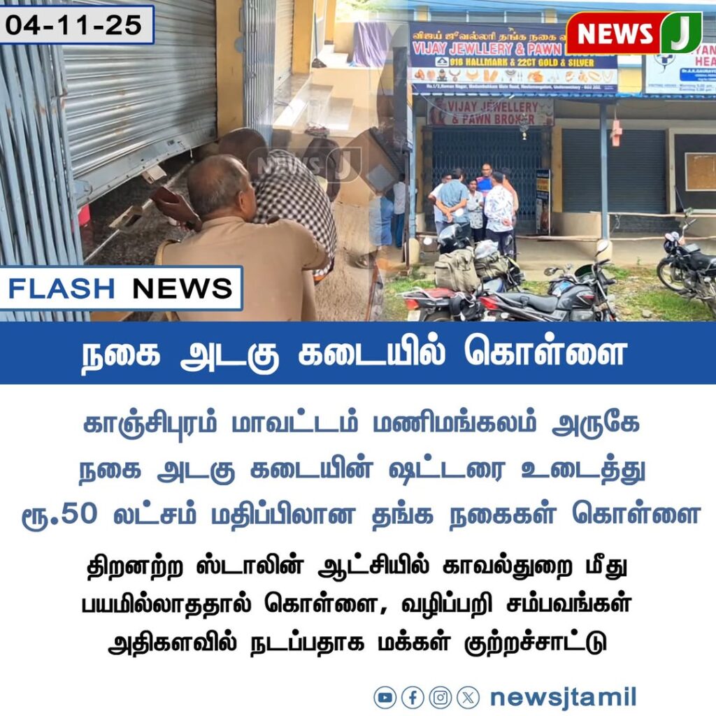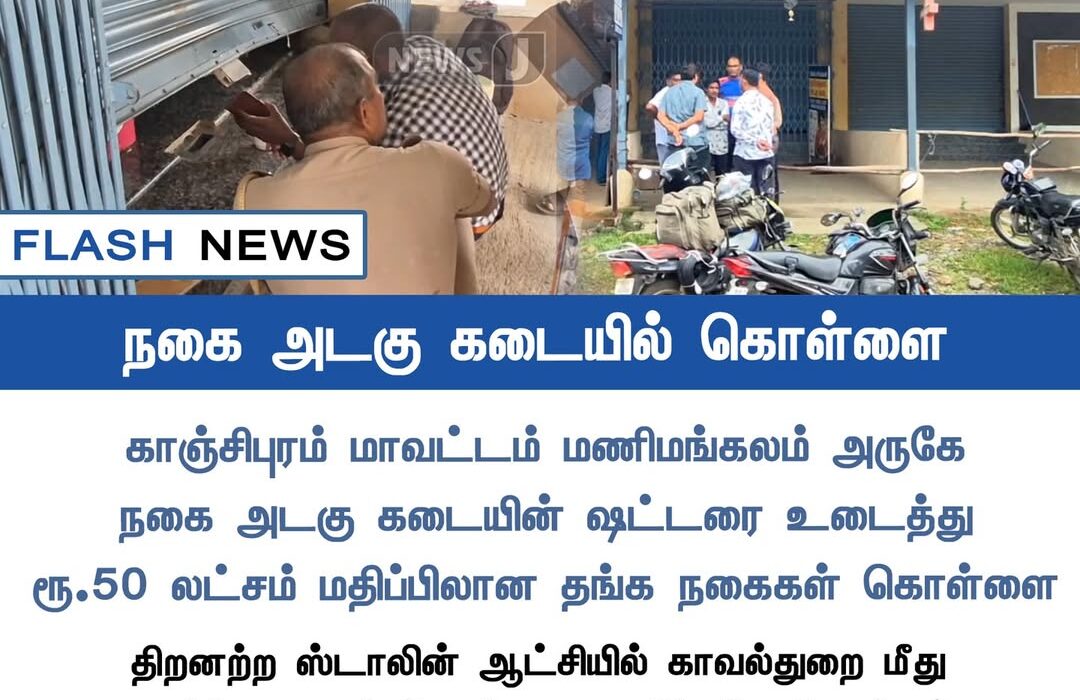 காஞ்சிபுரம் மாவட்டம் மணிமங்கலம் அருகே உள்ள ஒரு நகை அடகு கடையின் ஷட்டரை உடைத்து ரூ.50 லட்சம் மதிப்பிலான தங்க நகைகள் கொள்ளை அடிக்கப்பட்டது. | A major robbery took place at a jewellery pawn shop near Manimangalam, Kanchipuram, where burglars broke open the shutter and escaped with gold ornaments worth ₹50 lakh.