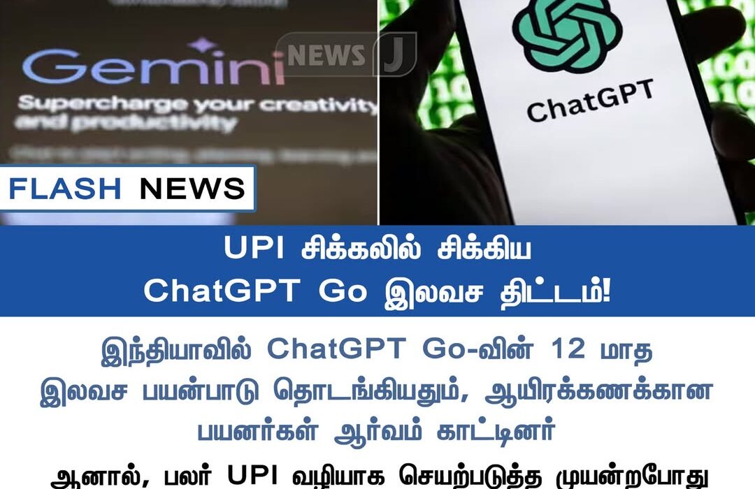 இந்தியாவில் ChatGPT Go-வின் 12 மாத இலவச பயன்பாடு தொடங்கியிருந்தாலும், ஆபிரிக்கணக்கான பயனர்கள் தற்போது UPI வழியிலான பணப்பரிவர்த்தனை சிக்கல்கள் குறித்து புகார் தெரிவித்துள்ளனர். | Although ChatGPT Go’s free 12-month plan launched in India recently, thousands of users have reported payment issues via UPI while activating the plan.